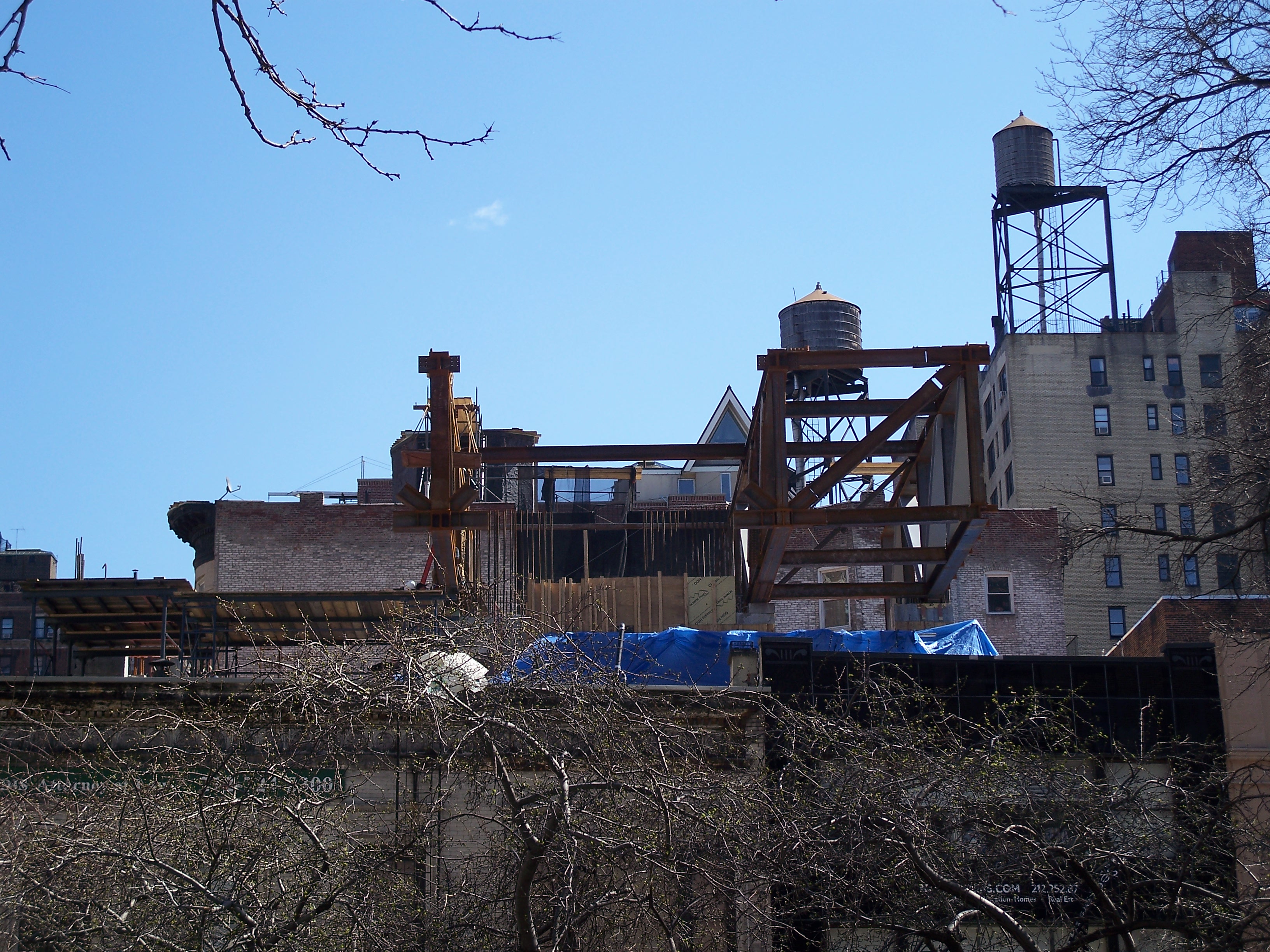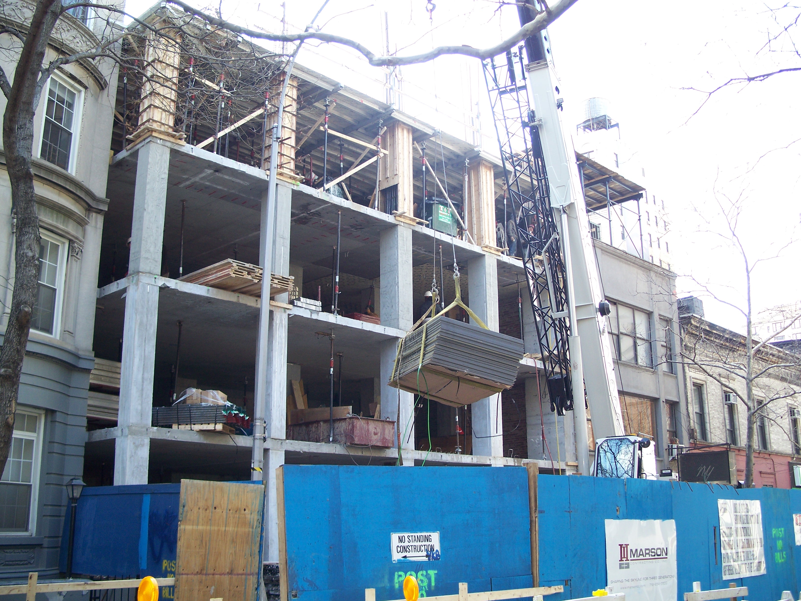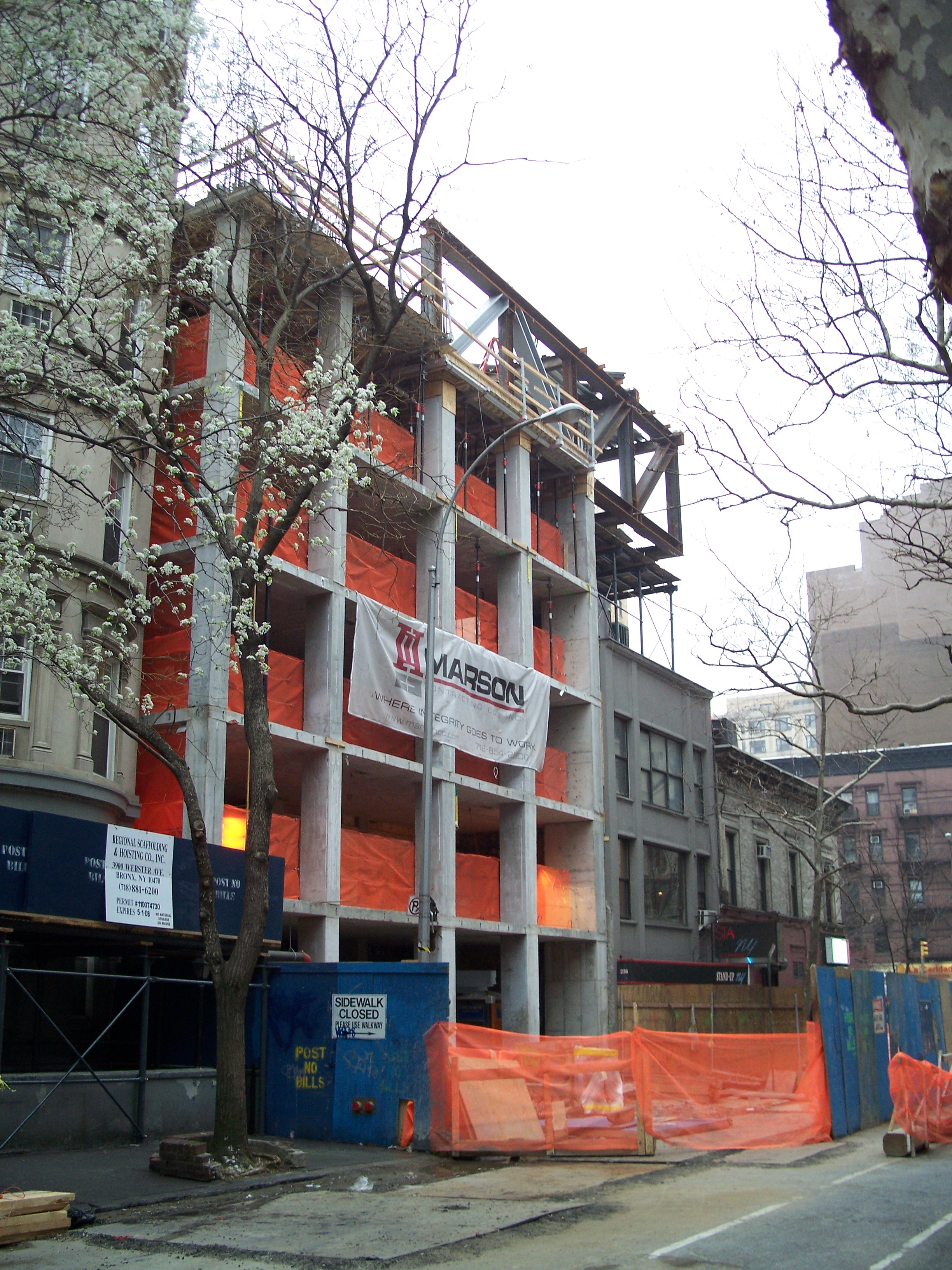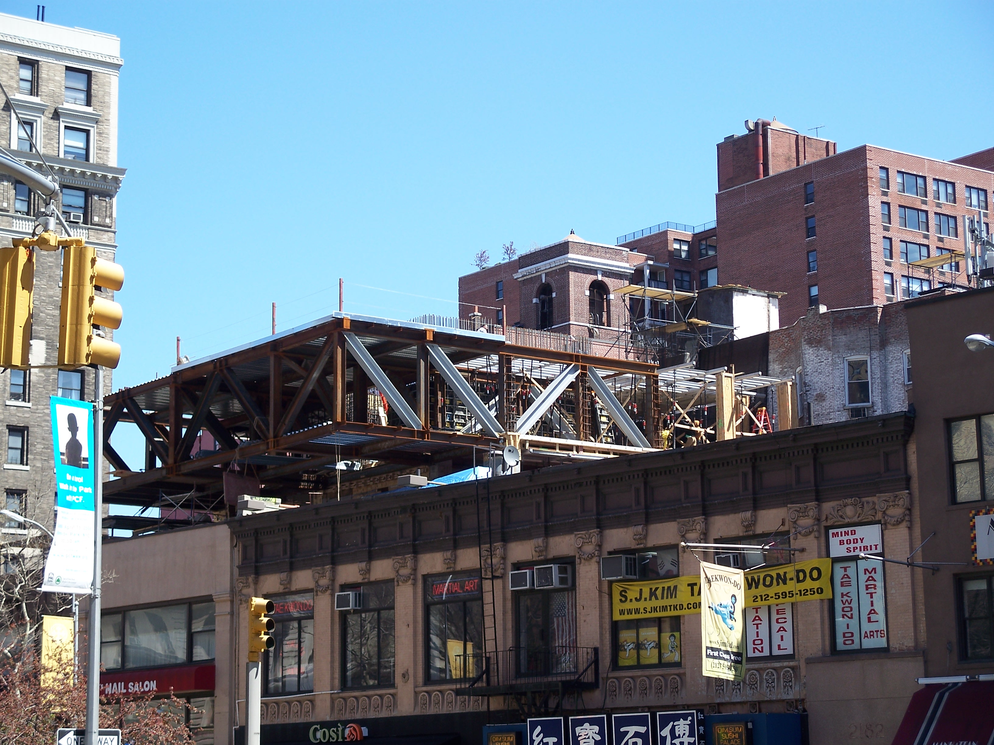 The Linden 78. Perhaps most notable for it's use of an internal truss to cantilever the western part of the building over an adjacent brownstone (housing the 78th Street Theatre Lab and StandUp NY Comedy Club). The brownstone was purchased with air rights in the 1970s when this was a much less expensive neighborhood. Presumably, this was a way to use the air rights while preserving his own building.