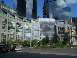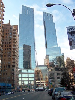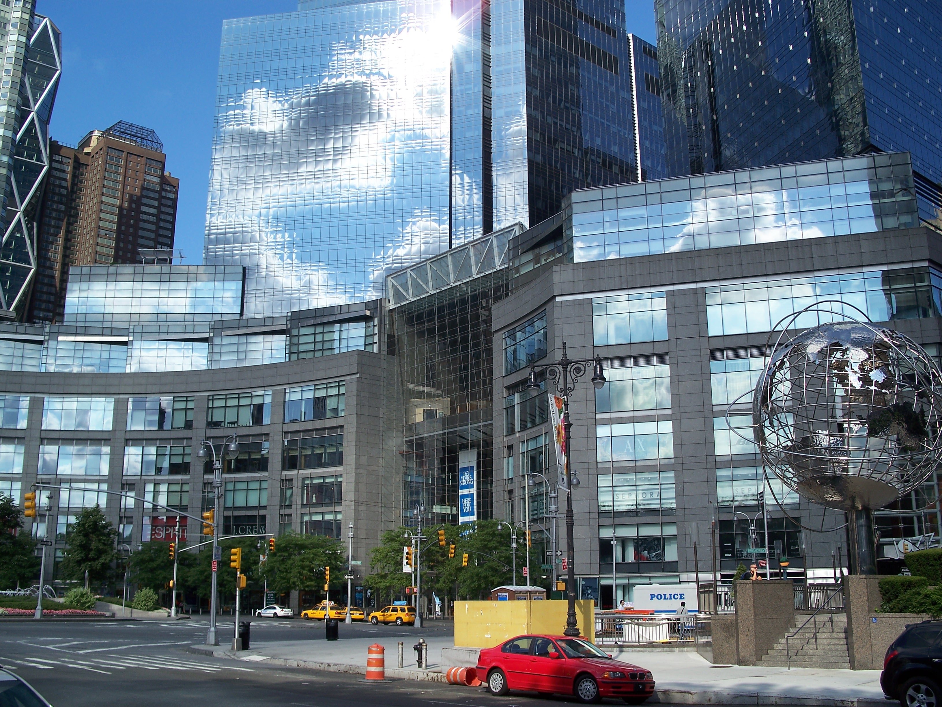 The superblock site was created for and previously occupied by The New York Coliseum, a convention center that was part of Robert Moses' urban renewal project for Lincoln Square. The design by Leon and Lionel Levy in a modified international style included both the exhibition building and a twenty-six-story office tower. It was a notoriously bland structure, although, as was discovered during demolition, very sturdy. It opened on April 28, 1956 but was outmoded just thirty years later with the opening of the Jacob Javits Convention Center. Legal restrictions prevented it from competing with the Javits Center and the exhibition space remained largely unused until demolition in 2000.