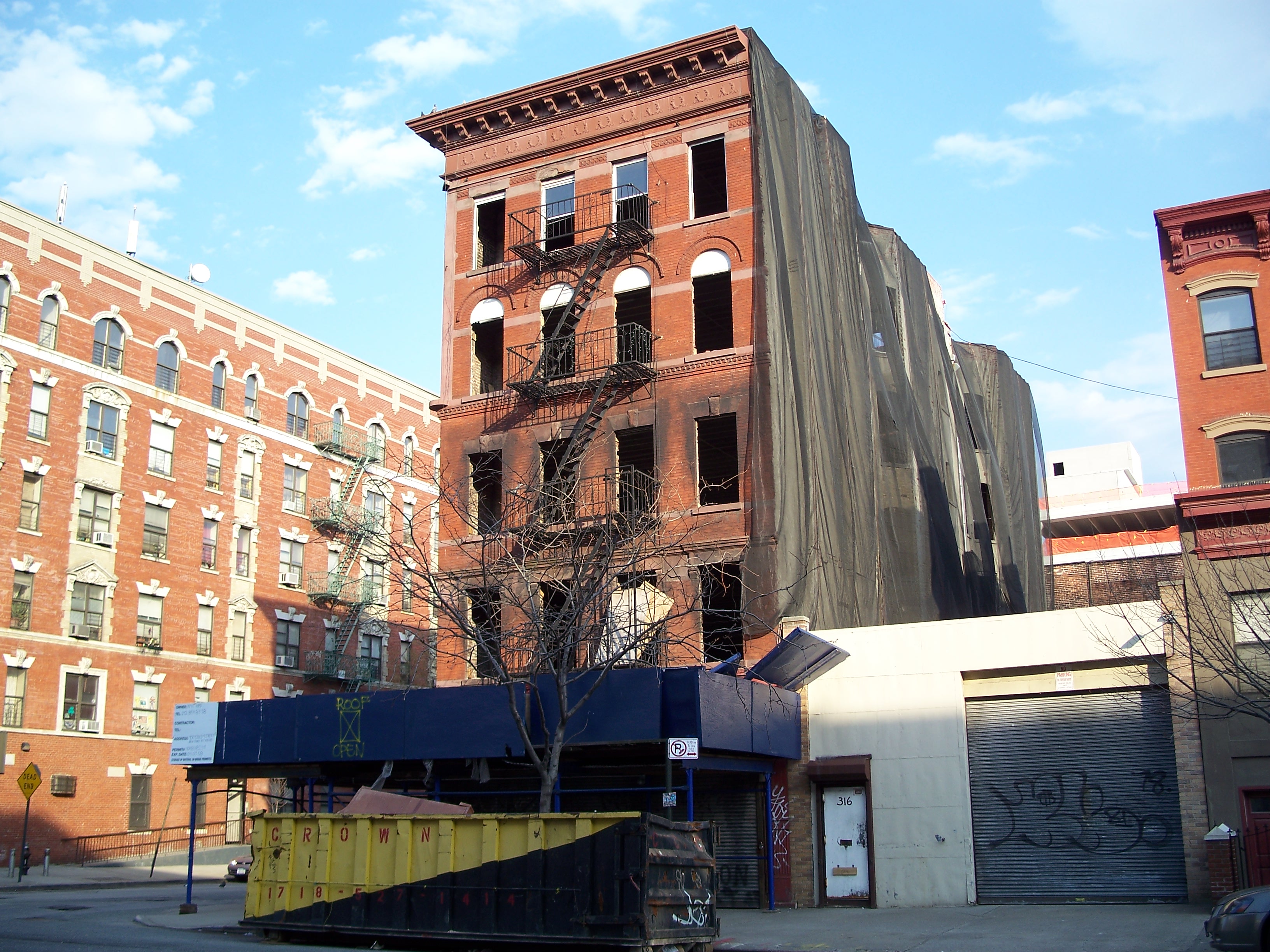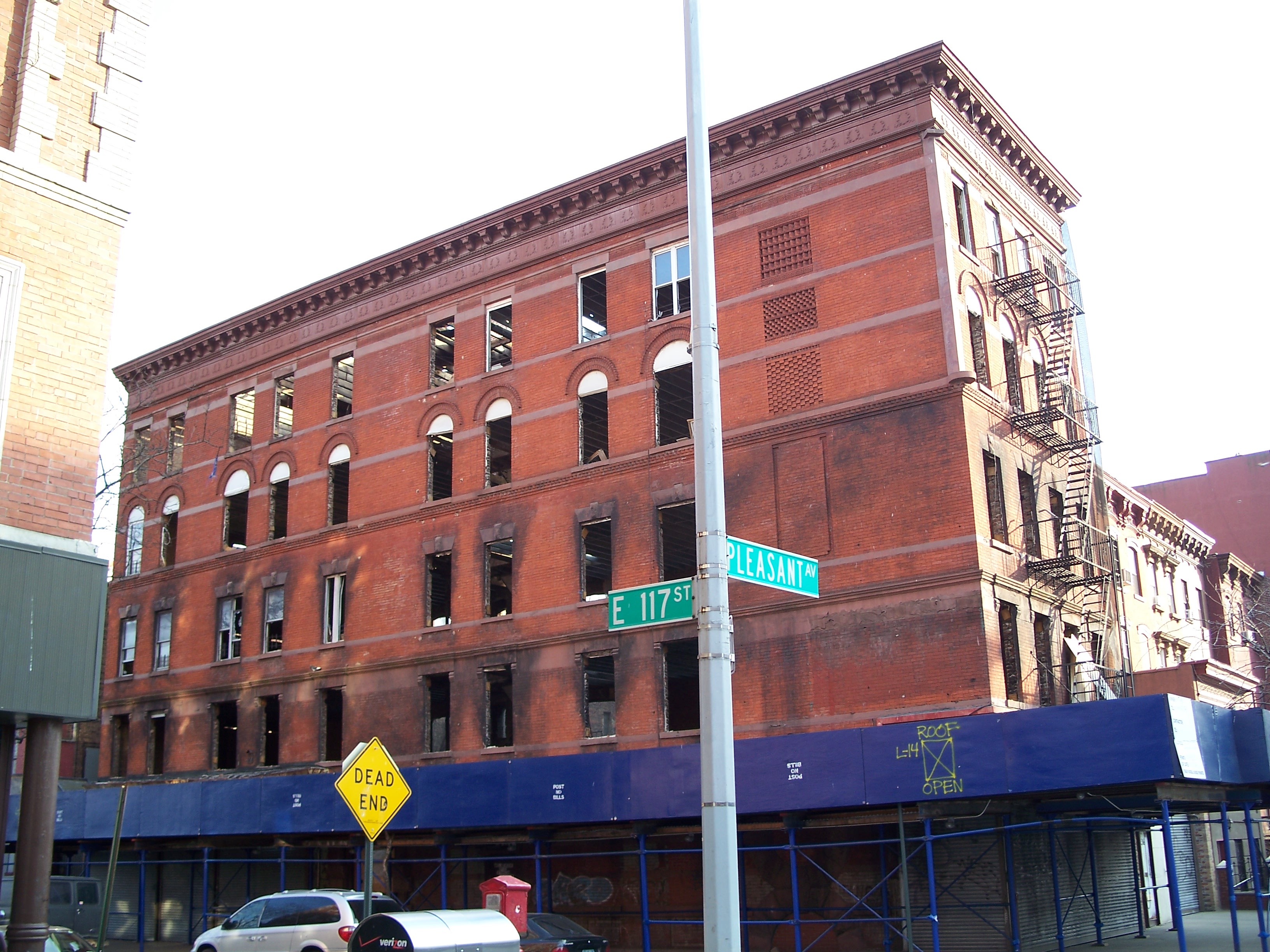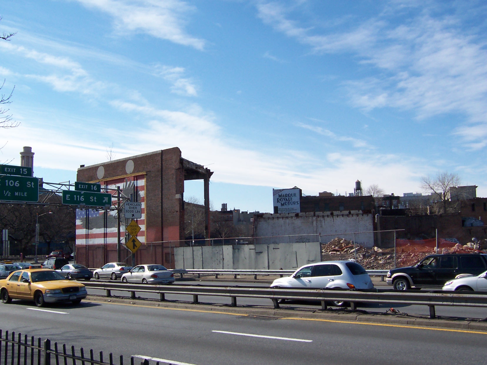 The surrounding area, amusingly named Pleasant Avenue, didn't seem particularly blighted, although it certainly was not an upscale neighborhood. The burned out hulk of an old walkup apartment building did catch my eye, but I don't know if there's any tale of landlord malfeasance involved. Marque Royale Motors (the painted wall sign on 116th Street in the 2005 photo) seems to have passed into history.