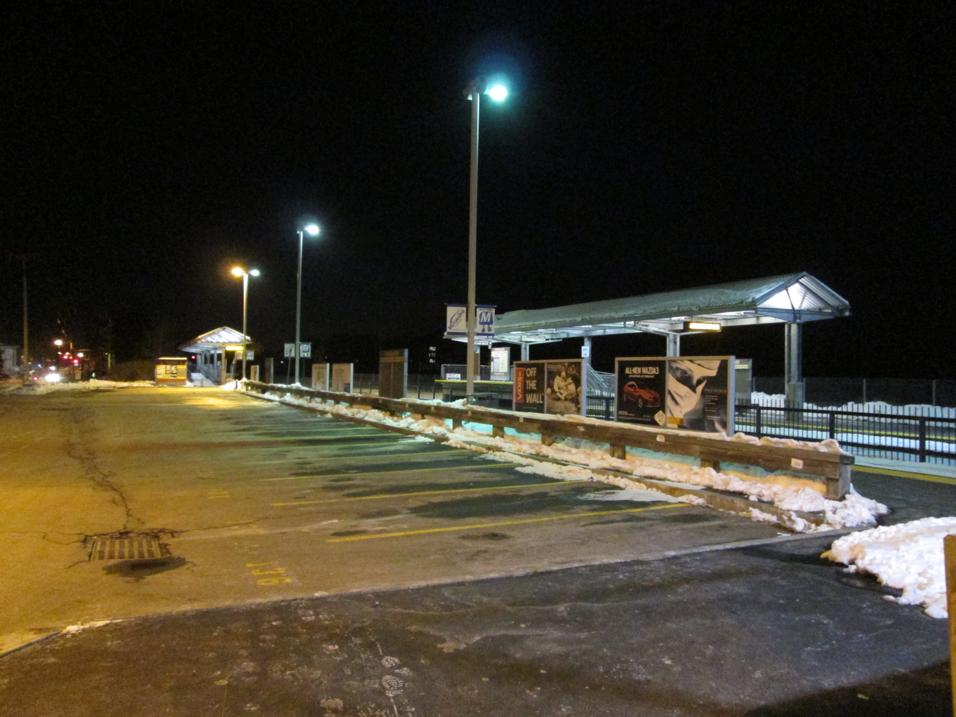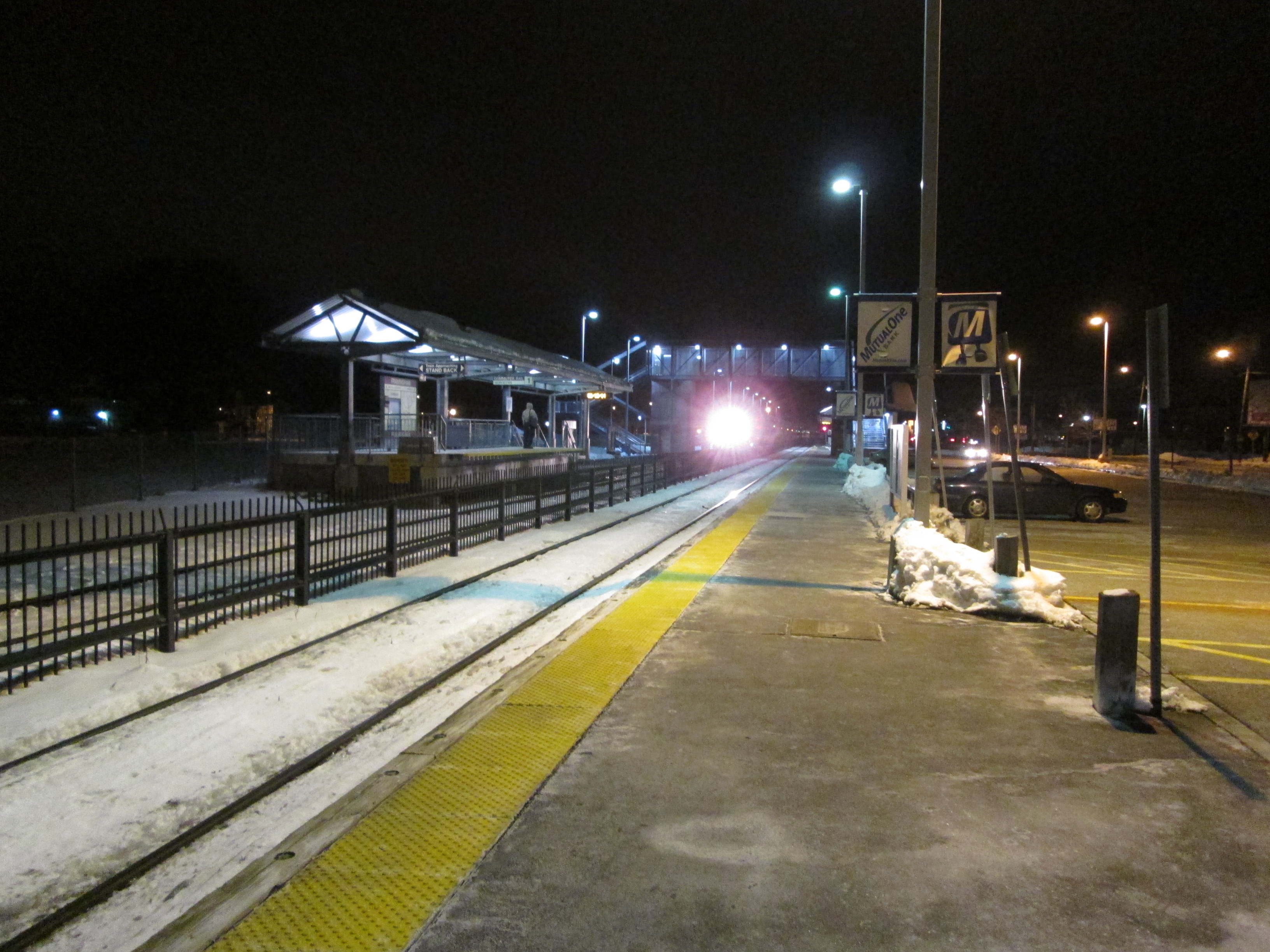 The current platforms and footbridge just to the East opened in 2001 to provide more-spacious access that conforms to the Americans with Disabilities Act of 1990.