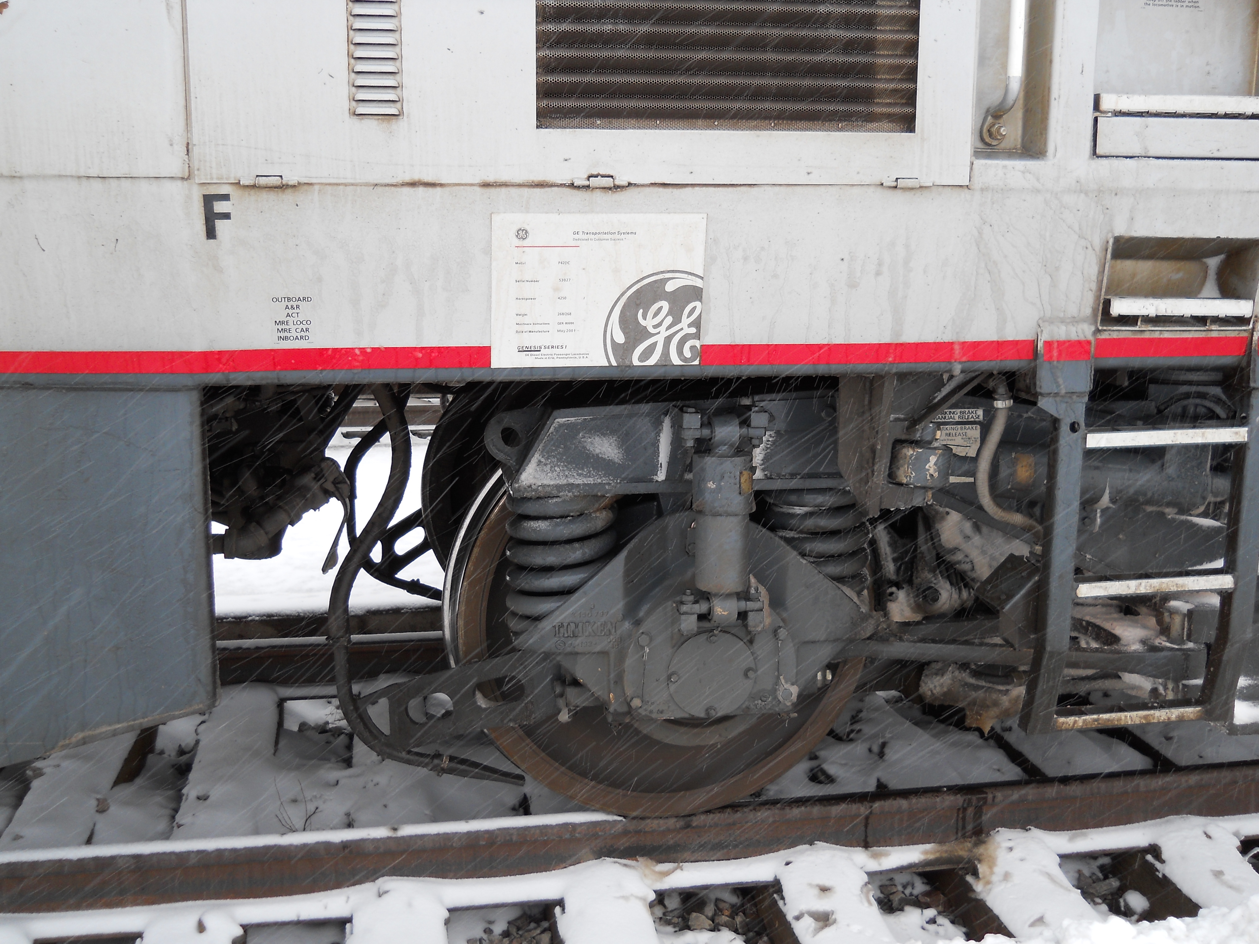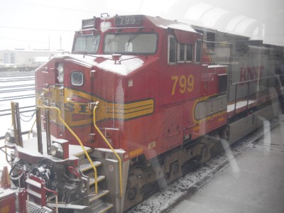 Our smoke stop in La Junta, CO gave me a chance to check out the train. We were being pulled by pair of GE P42DC four-axle locomotives, the front built in 2001 and the slave in 1997. They weigh 134 tons apiece and provided a combined 8,500 horsepower.