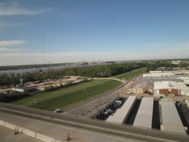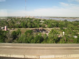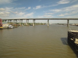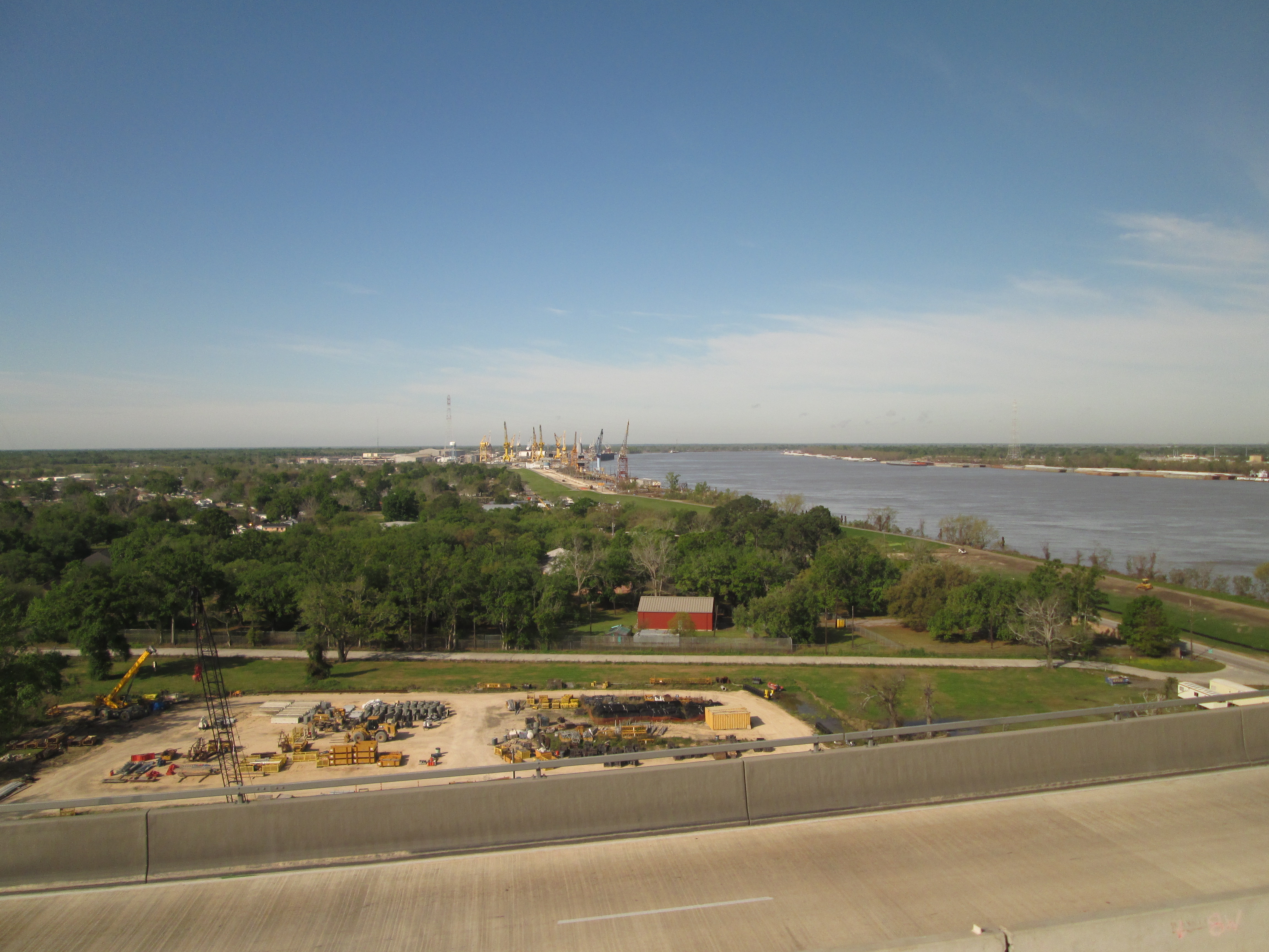 The Huey P. Long Bridge is a cantilevered steel through-truss bridge over the Mississippi River that opened in December of 1935. It was originally built to carry two rail tracks and four (narrow) lanes of highway traffic. An expansion to six standard traffic lanes with shoulders was almost complete when I visited in 2013. The rail portion is especially impressive with long approaches that limit the grade to 1.25% but extend the total length to almost 23,000 feet in order to reach 135 above mean high water.
