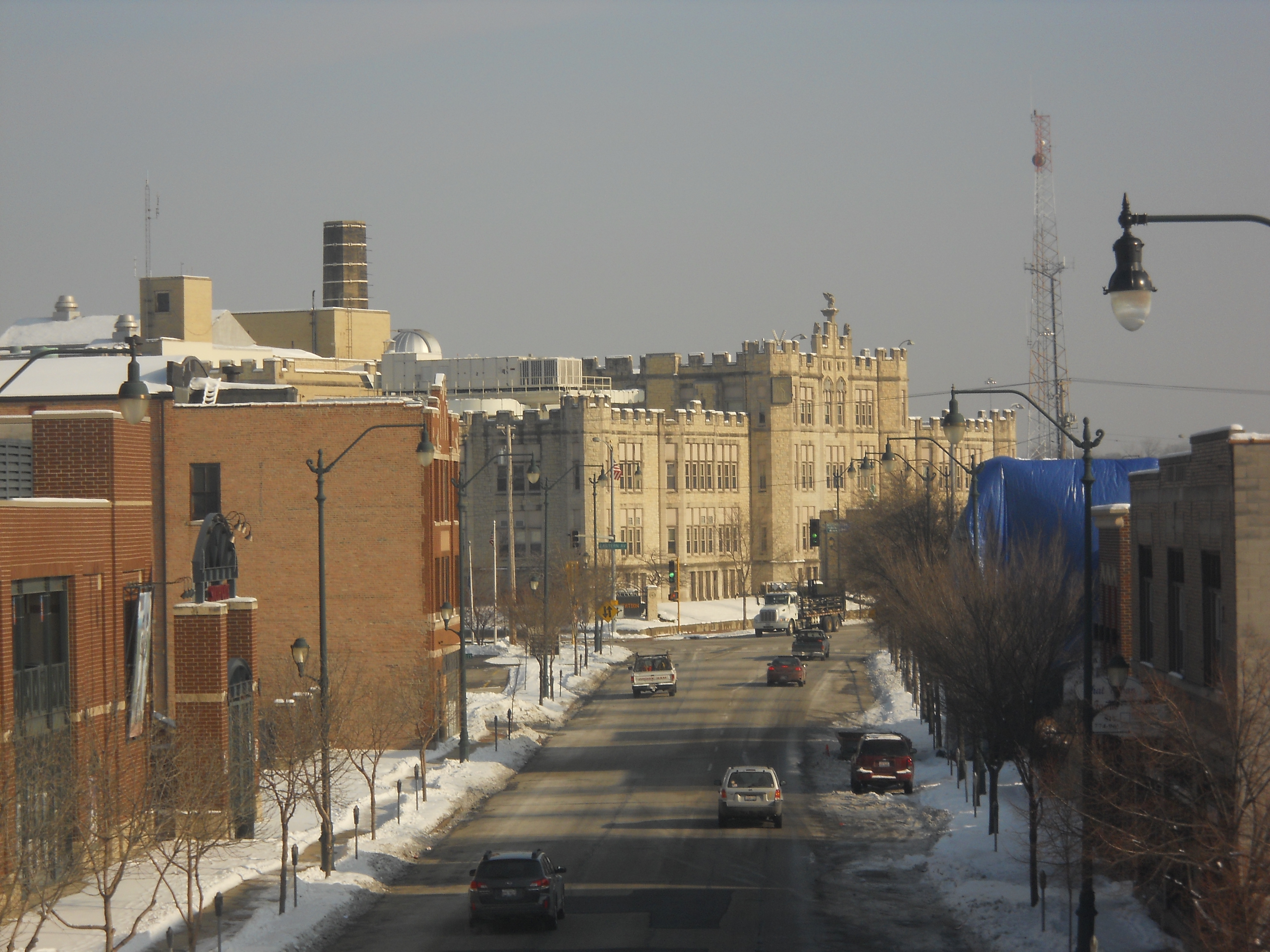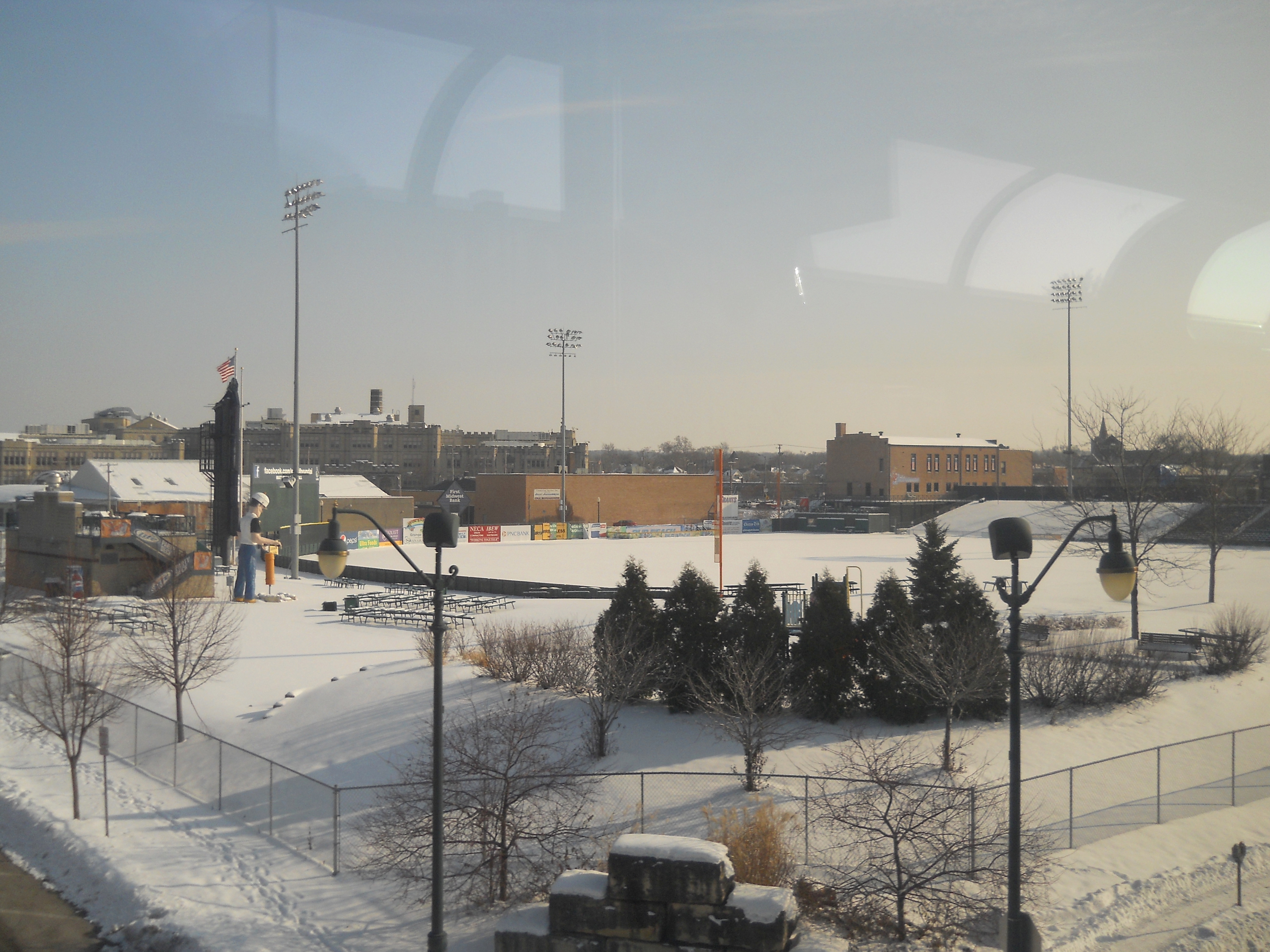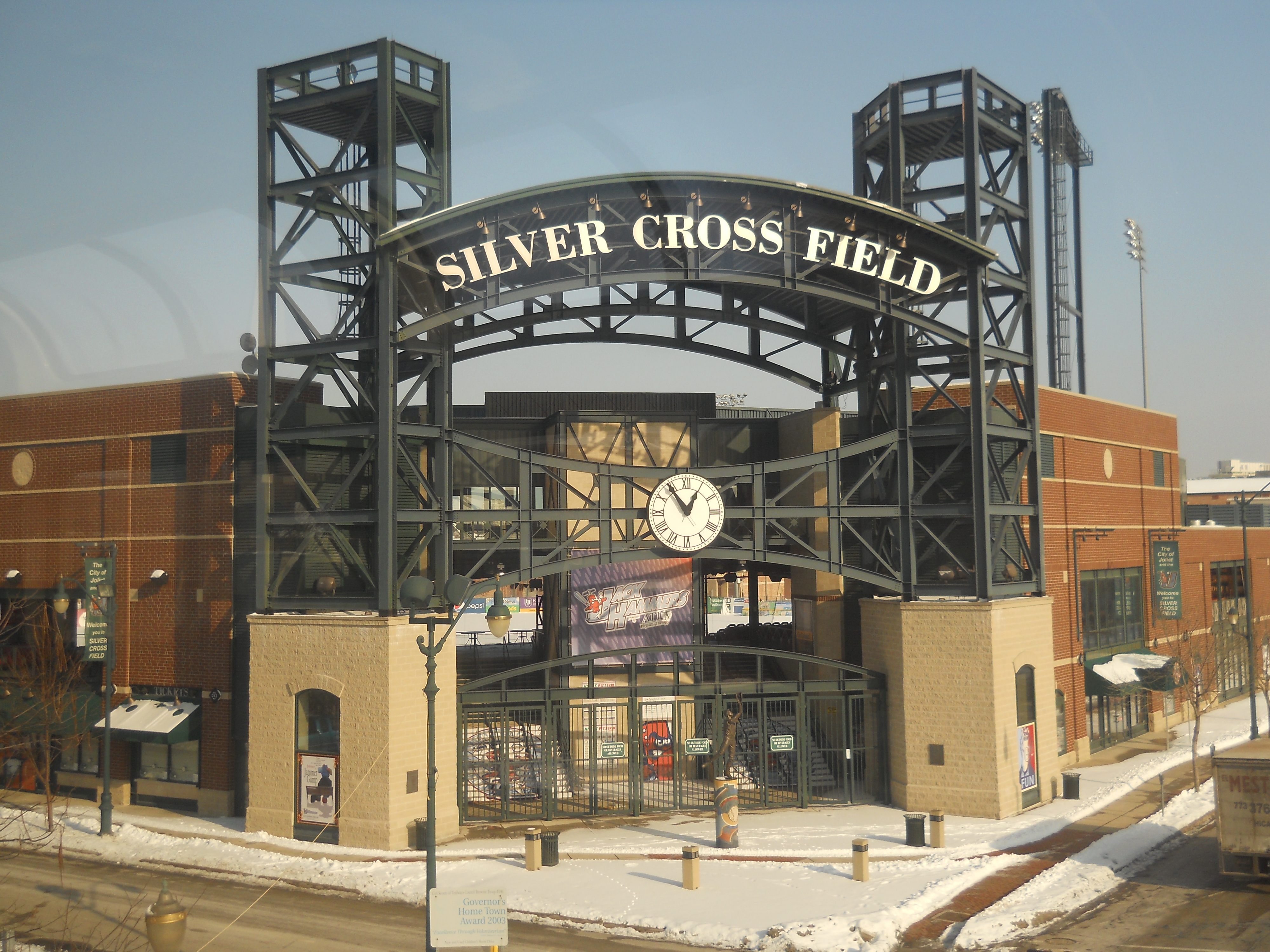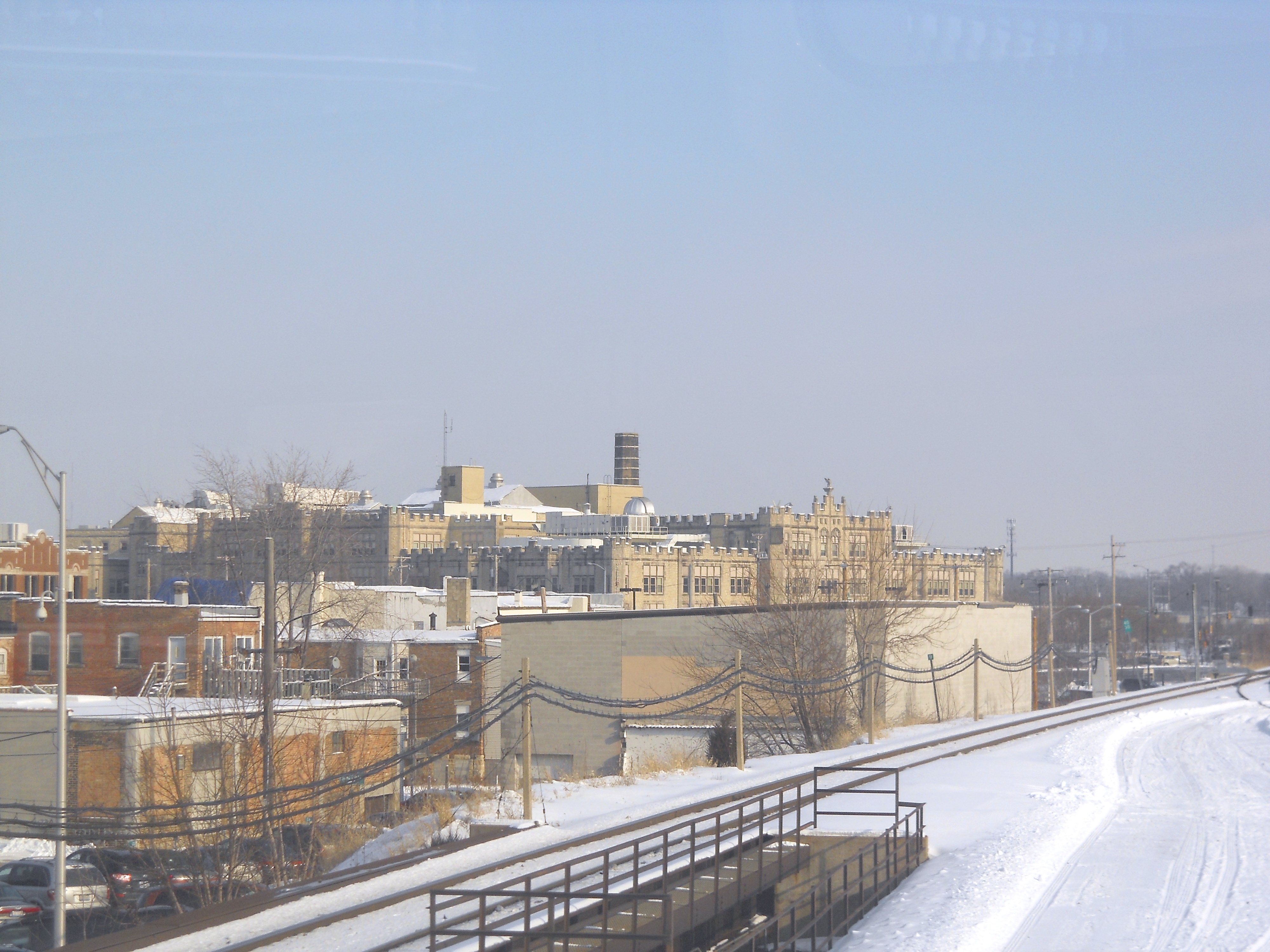Two notable features visible in Joliet from the train are the fortress-like Joliet Central High School, and the somewhat more festive Silver Cross Field, home to the Joliet JackHammers, a minor league baseball team unaffiliated with MLB.