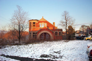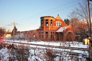 Romanesque structure built for the New York Central Railroad. Decommissioned in the 1940s. Served as a restaurant in the 1970s before being gutted by fire. Just a shell remained when I visited in 2001.