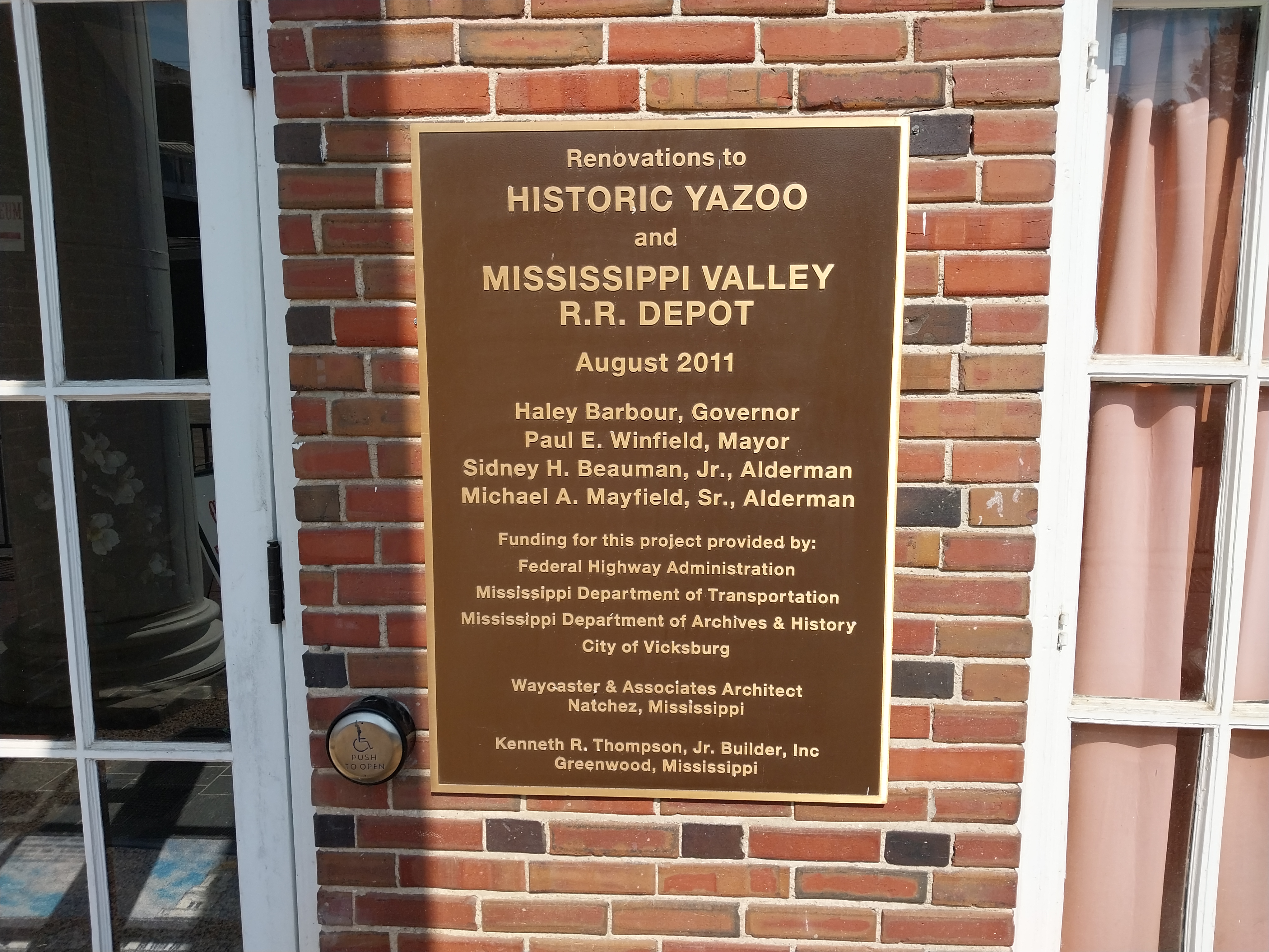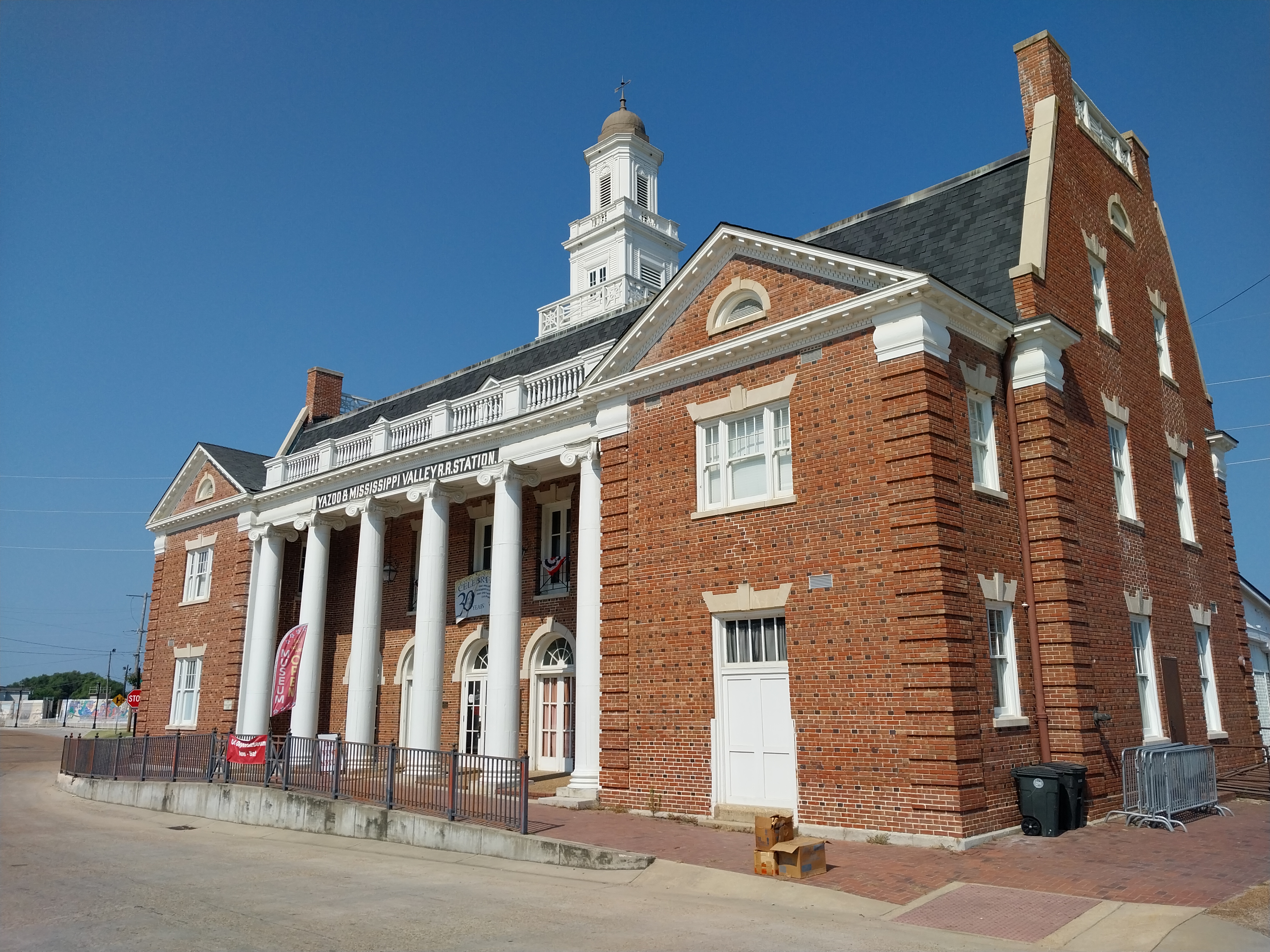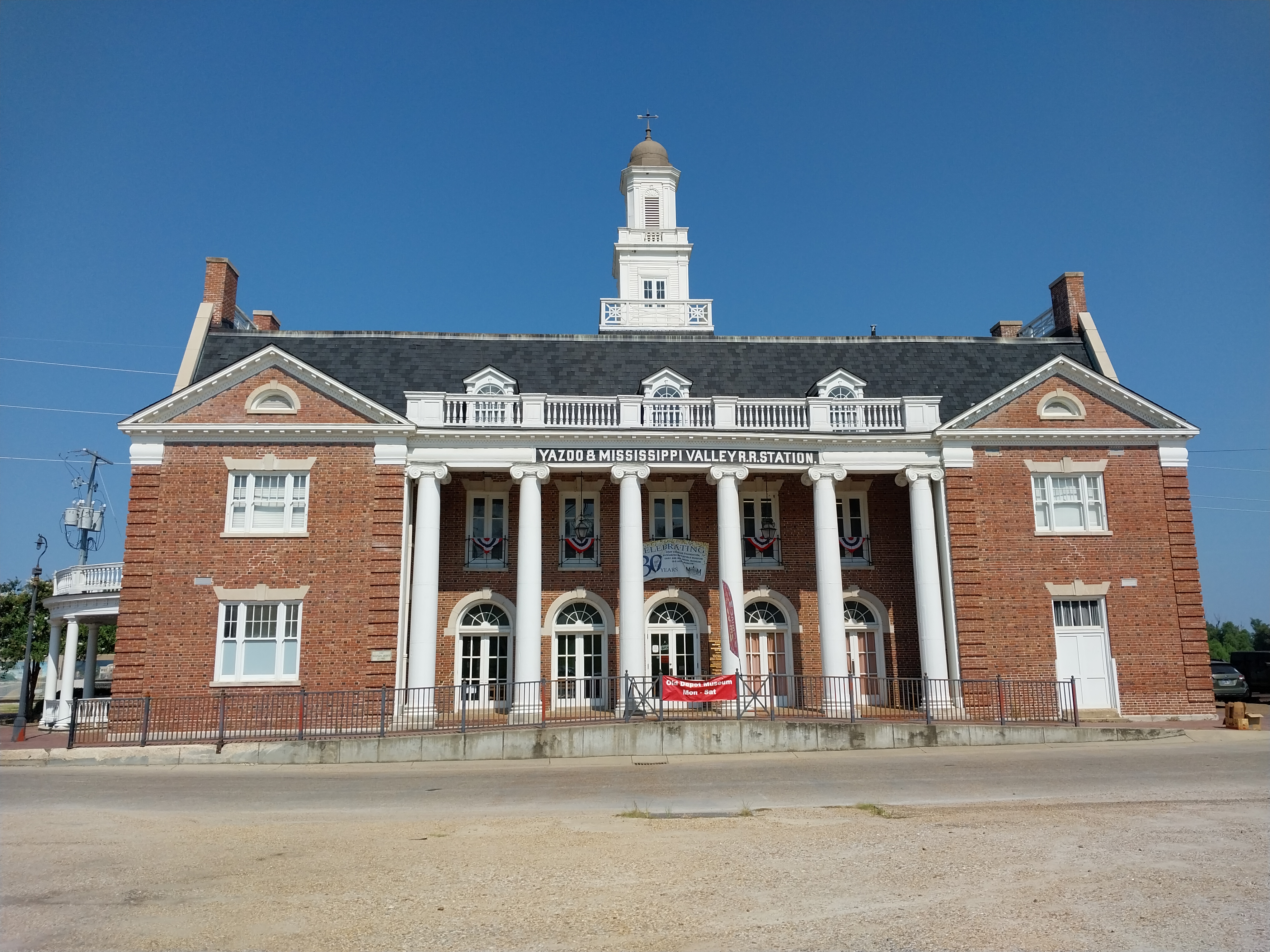 The Yazoo and Mississippi Valley Railroad was incorporated in 1882 as part of the Illinois Central Railroad system. This depot in Vicksburg, MS on a mainline between Memphis and Baton Rouge was built north of the Mississippi River floodwall and is susceptible to flooding. The building was flooded above the first floor in both the great 1927 flood and another major flood in 2011 while undergoing restoration as the Old Depot Museum.