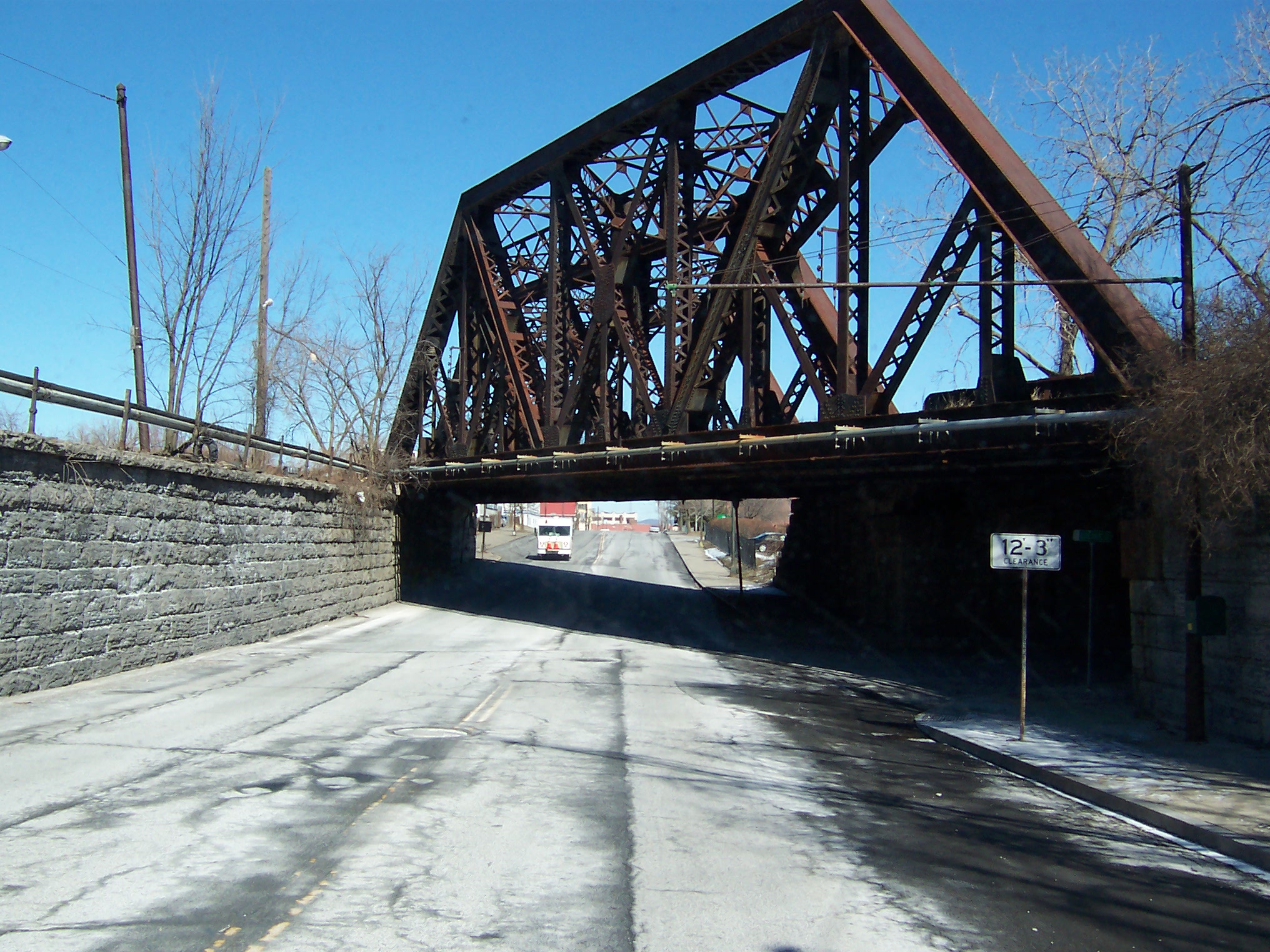 This imposing through-truss rail bridge is short but unusually tall, probably because it carries three tracks diagonally across Broadway. The line is carried across the Hudson River just to the East by the Livingston Avenue Rail Bridge, a 1901 swing bridge owned by CSX that also carries Amtrack traffic from the Albany/Rensselaer station to points west.