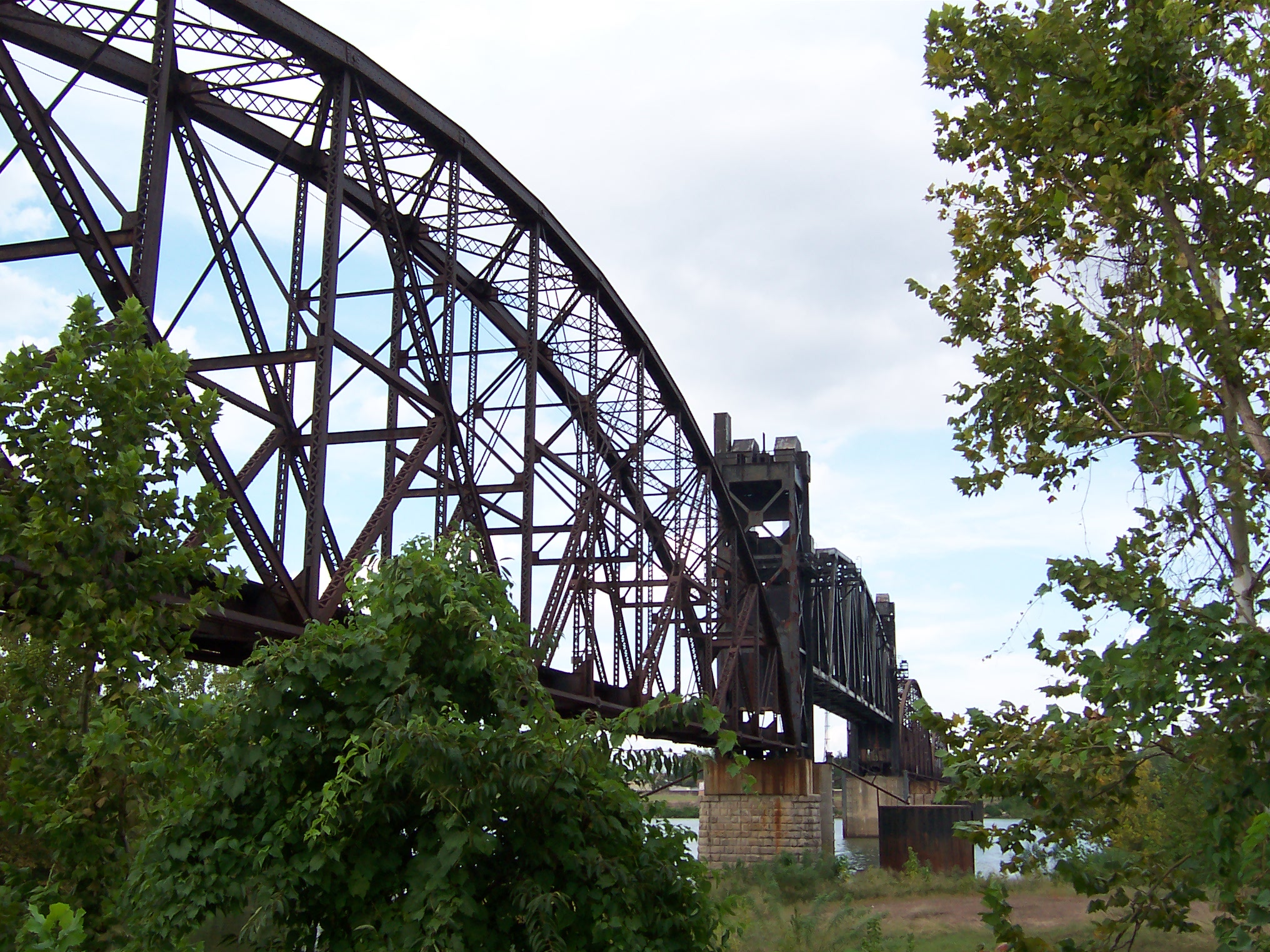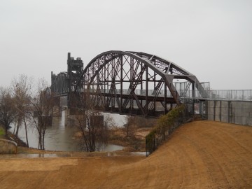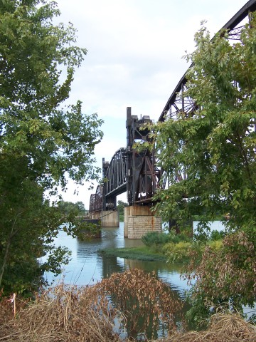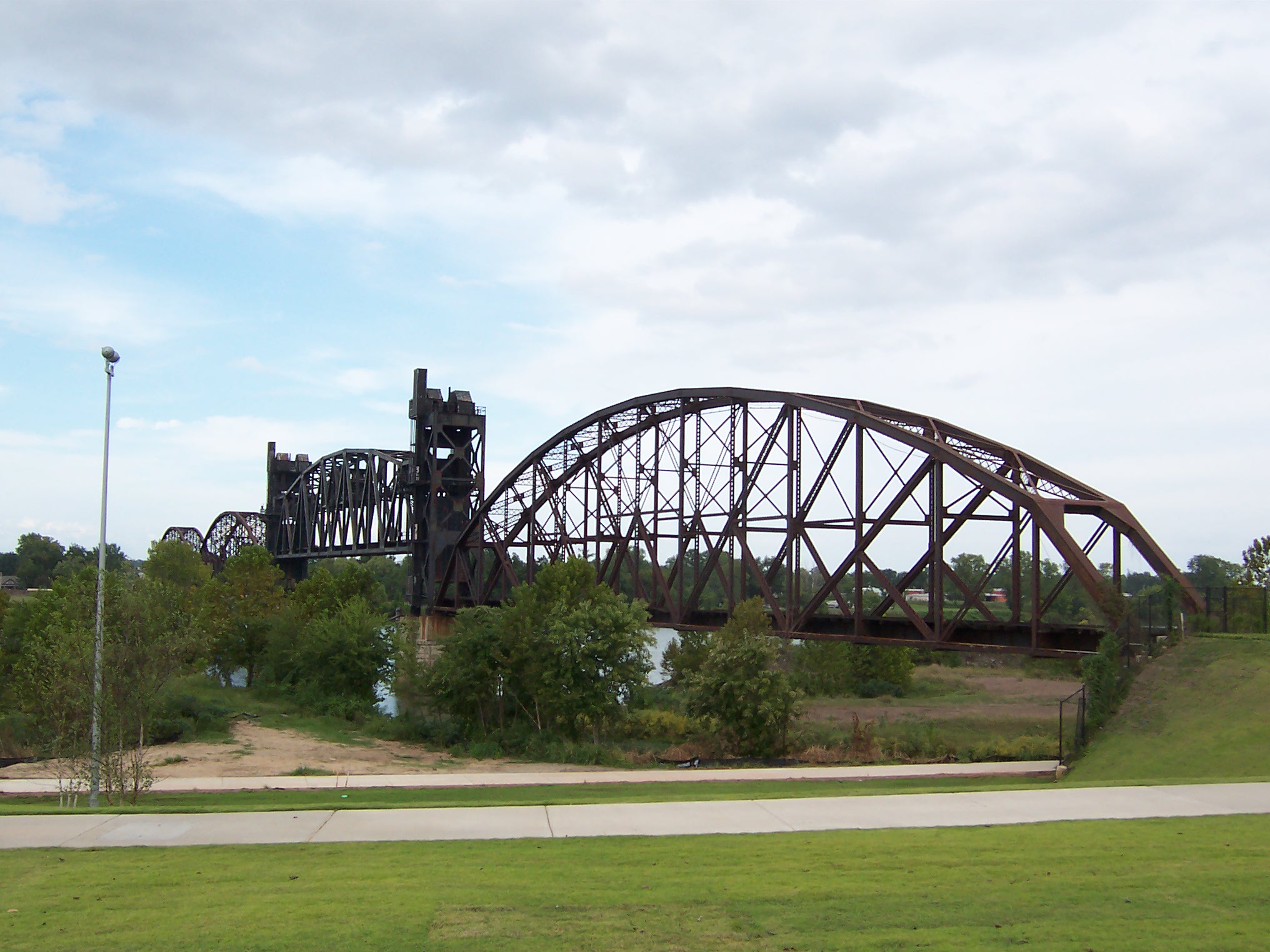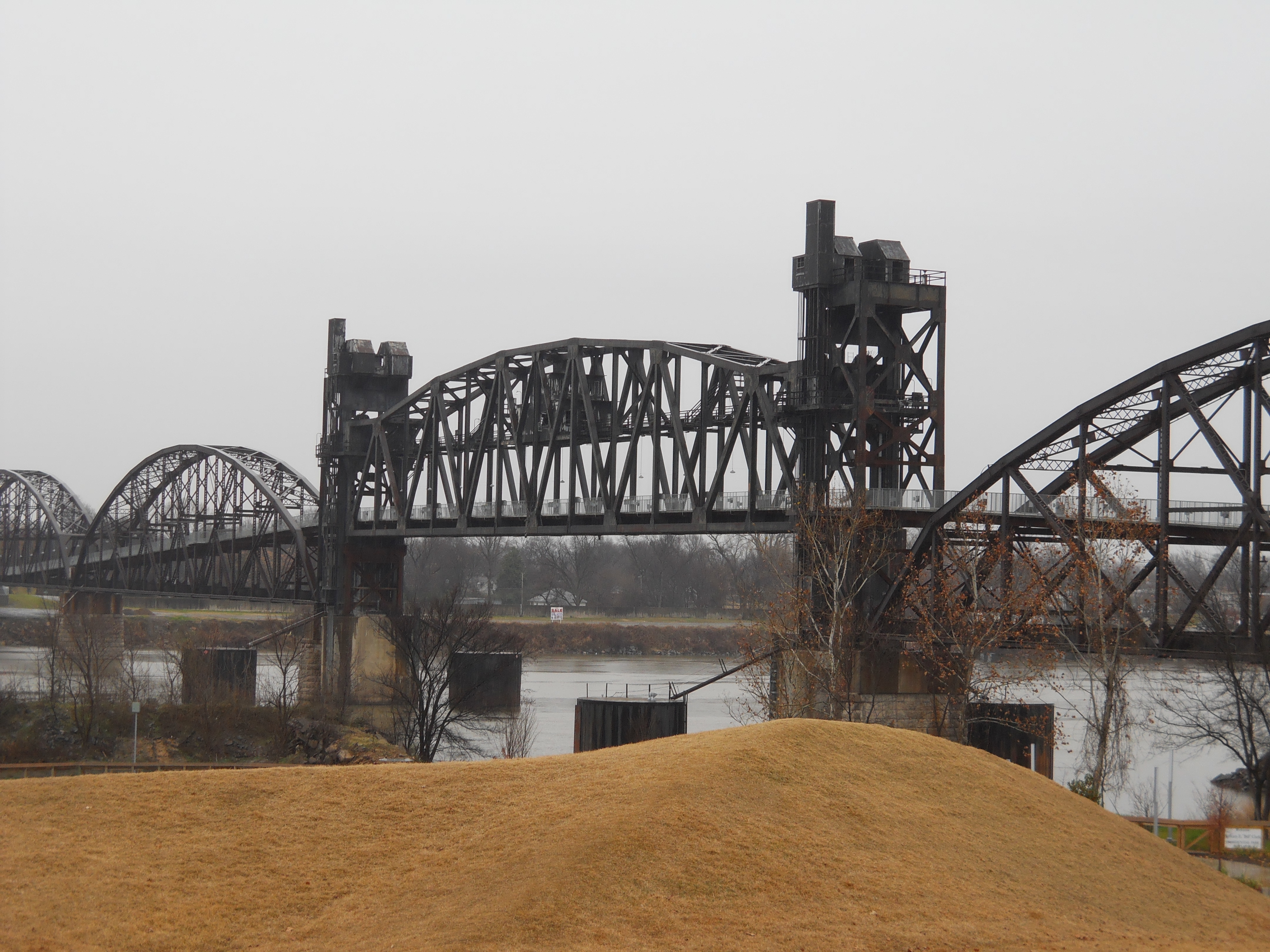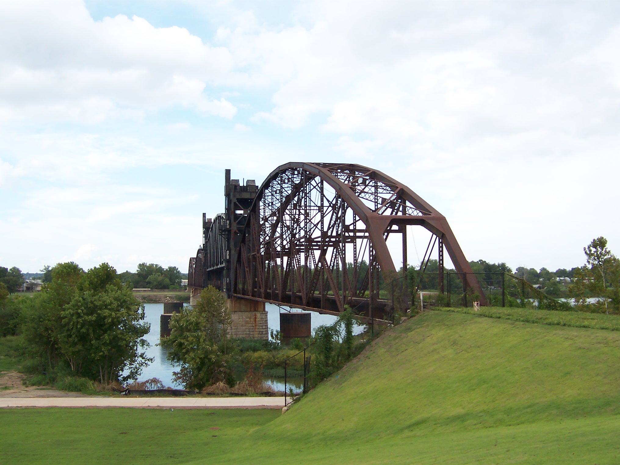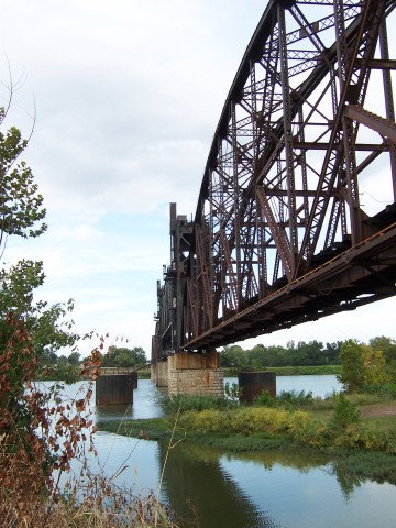 The Rock Island Bridge is an attractive through-truss vertical-lift railroad bridge over the Arkansas River near the Clinton Presidential Library. It was built 1899 by the Choctaw and Memphis Railroad but transferred five years later when the Choctaw was acquired by the Chicago, Rock Island and Pacific Railroad. It remained in service until 1980 when the Rock Island was liquidated in bankruptcy and the bridge was acquired by the Union Pacific.