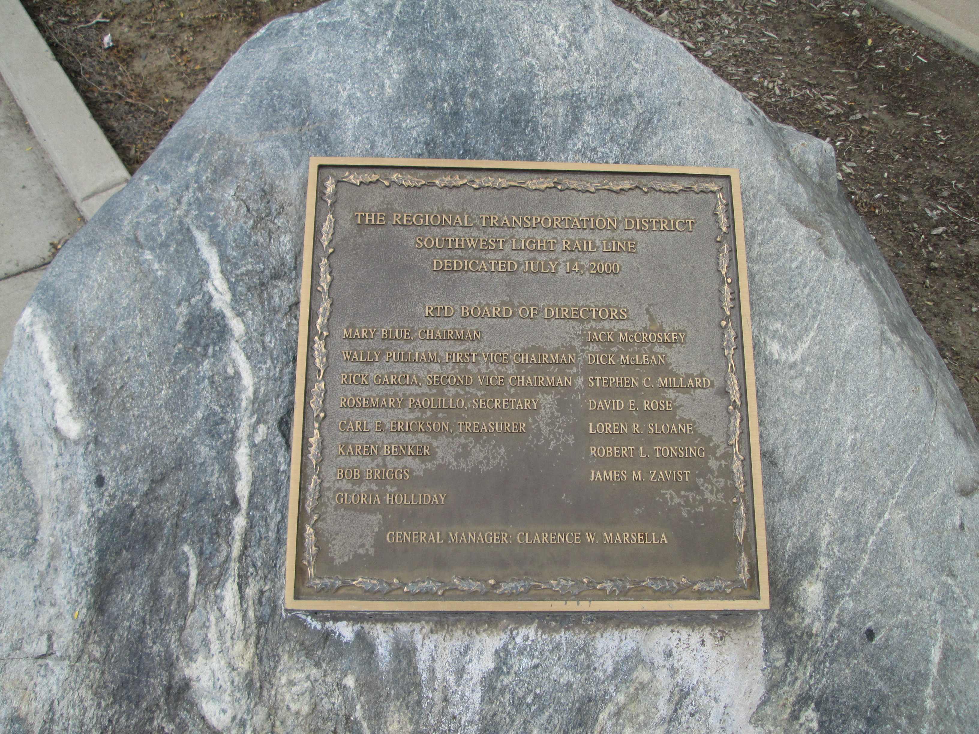 RTD Southwest Light Rail Line Plaque - 7/14/2000