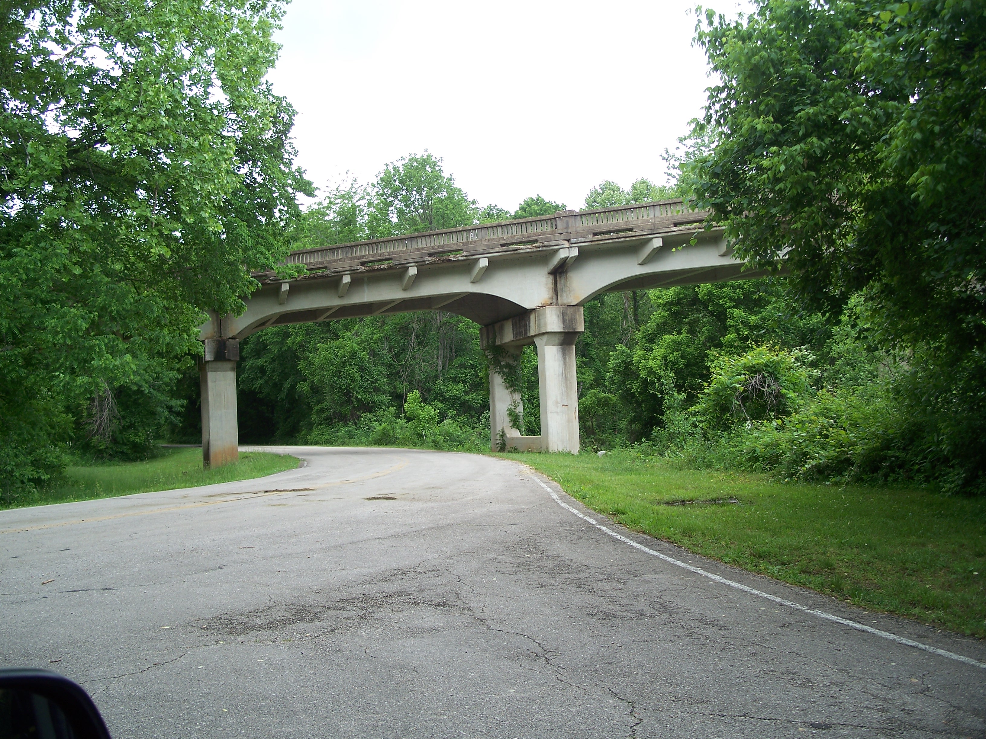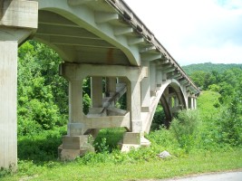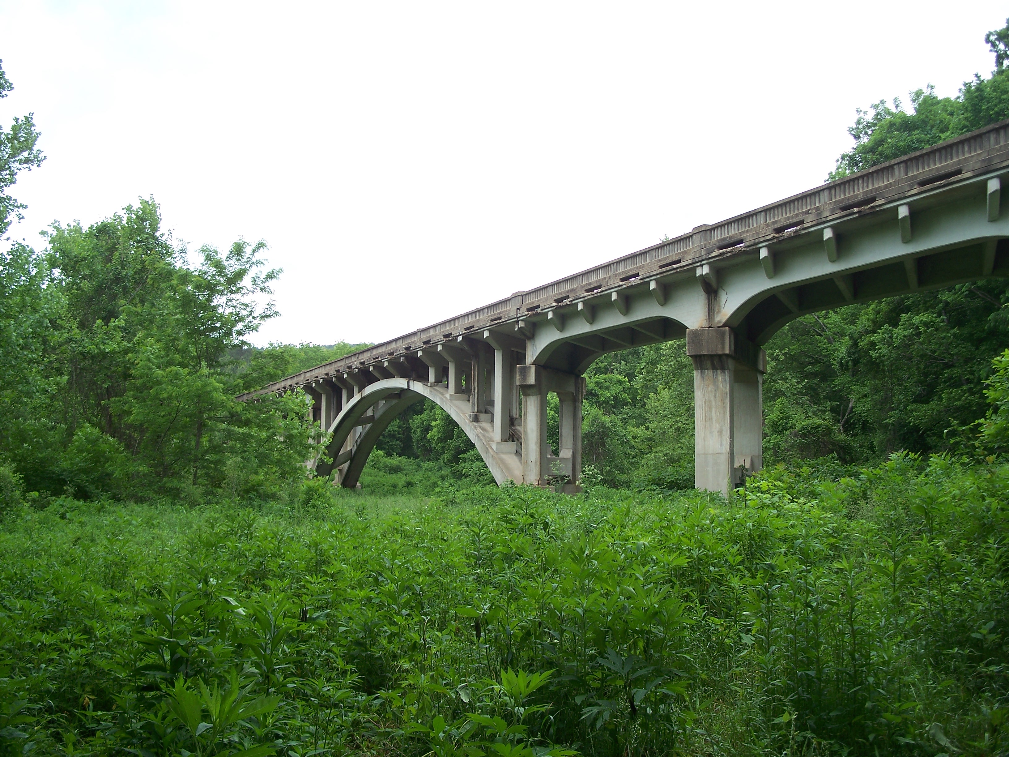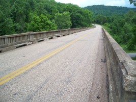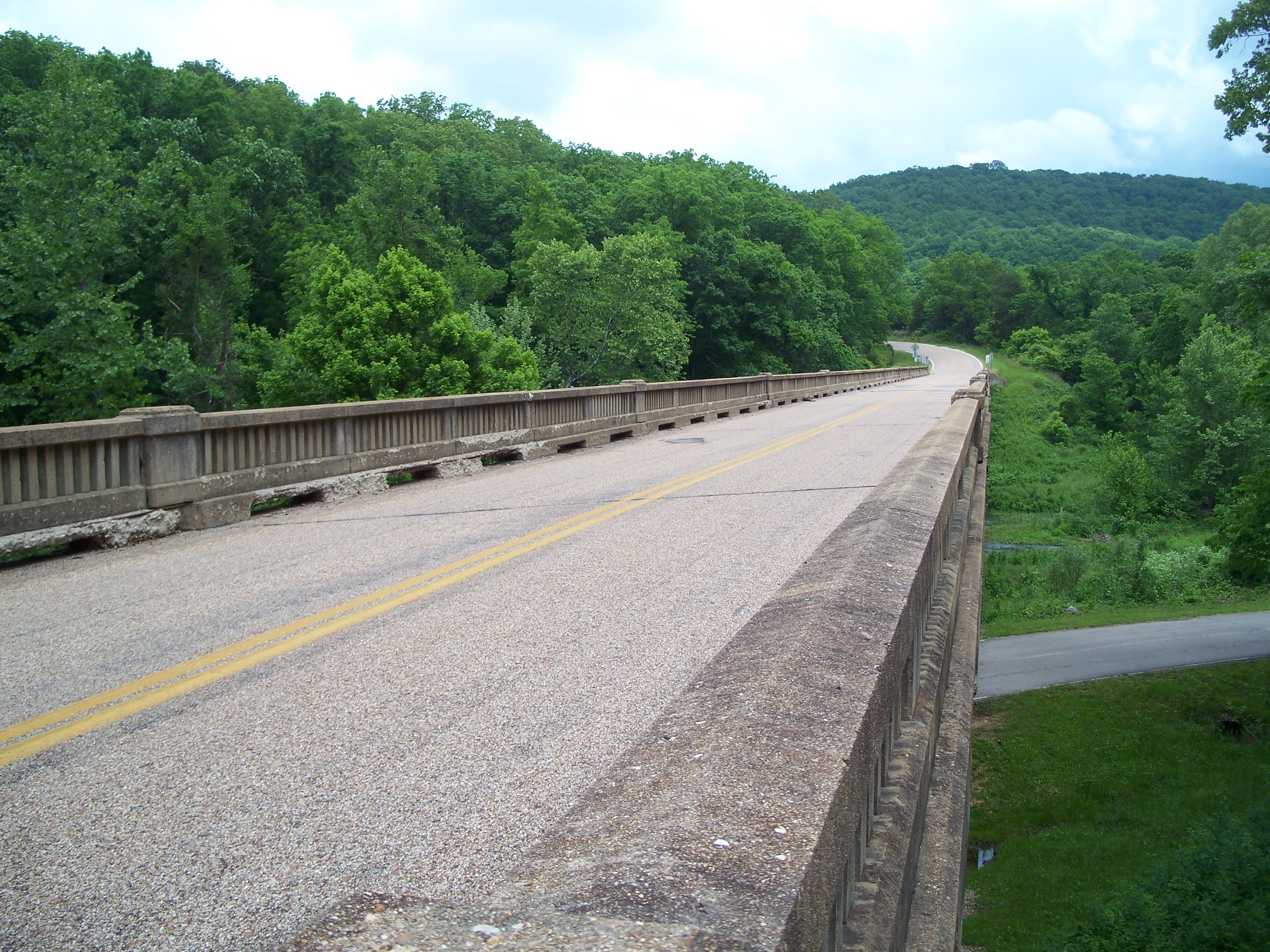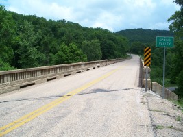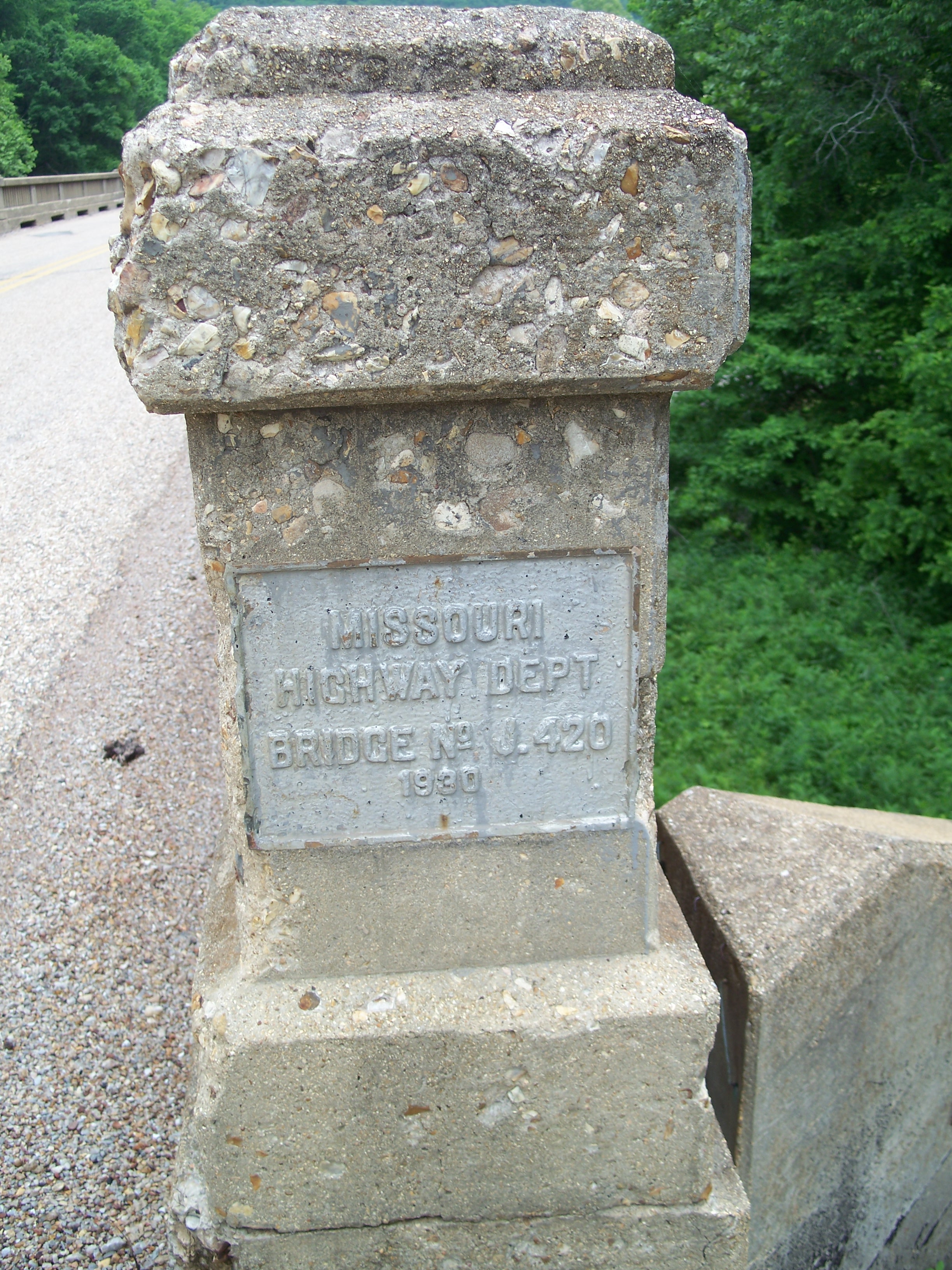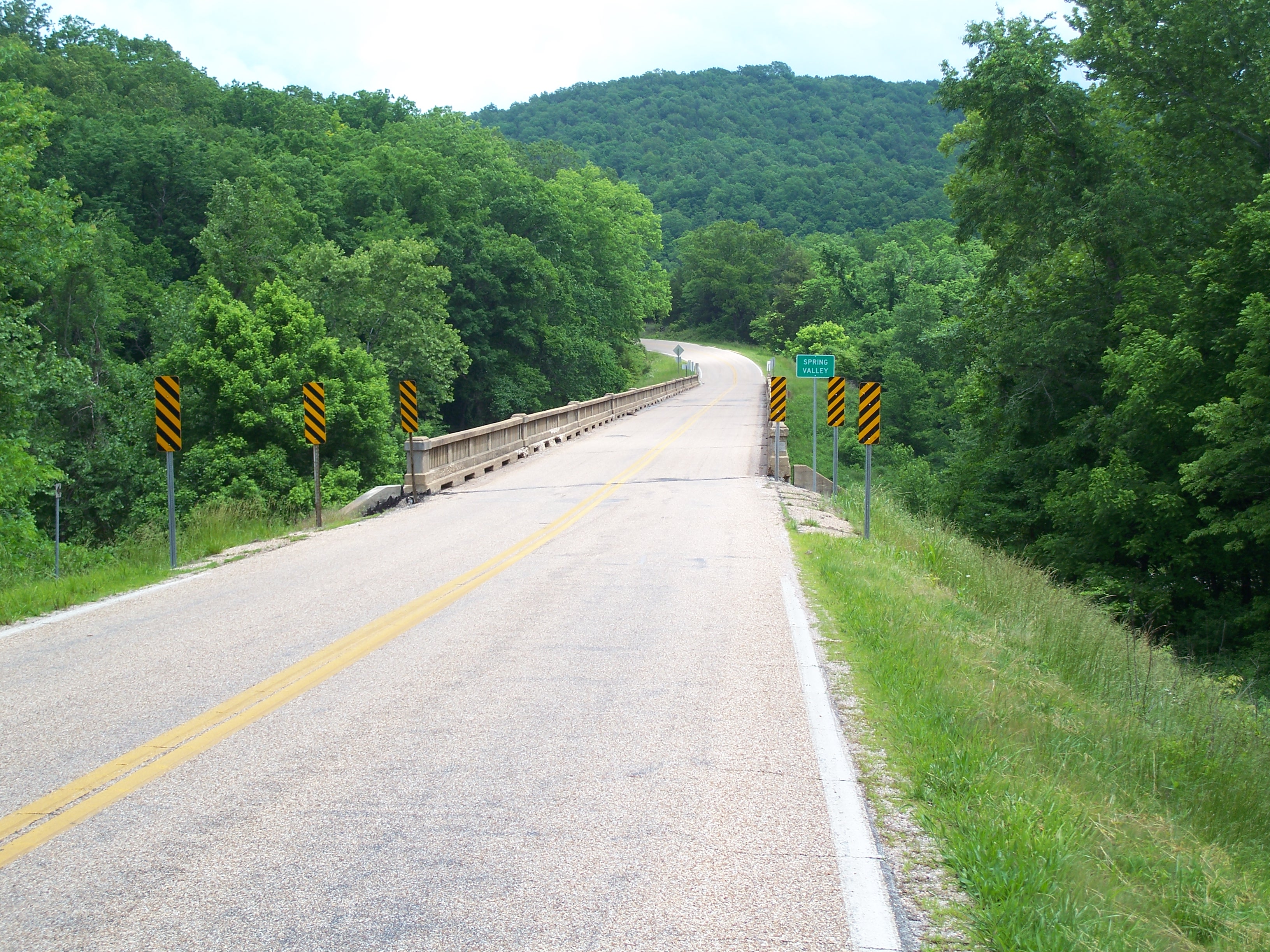 The southernmost of the trio of bridges crosses a valley where Round Spring feeds into the Current River. The bridge is a two-rib, open spandrel concrete arch with one main 150-foot span with concrete deck girder approach spans on both ends for a total length of 523 feet. The bridge was built in 1930 for $70,152.85 and bears structure number J 420.