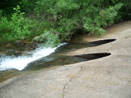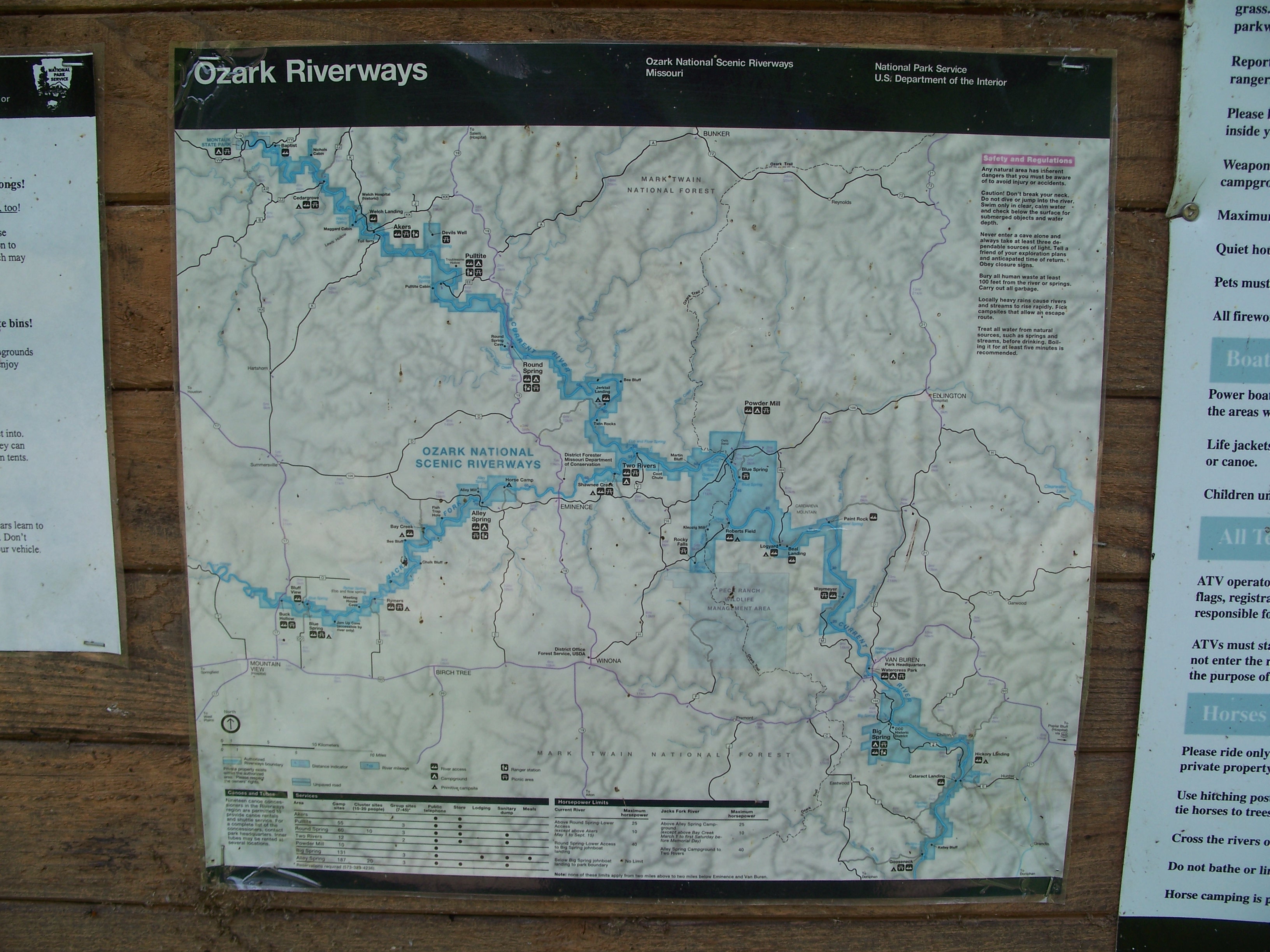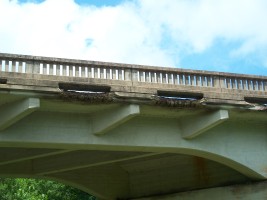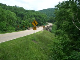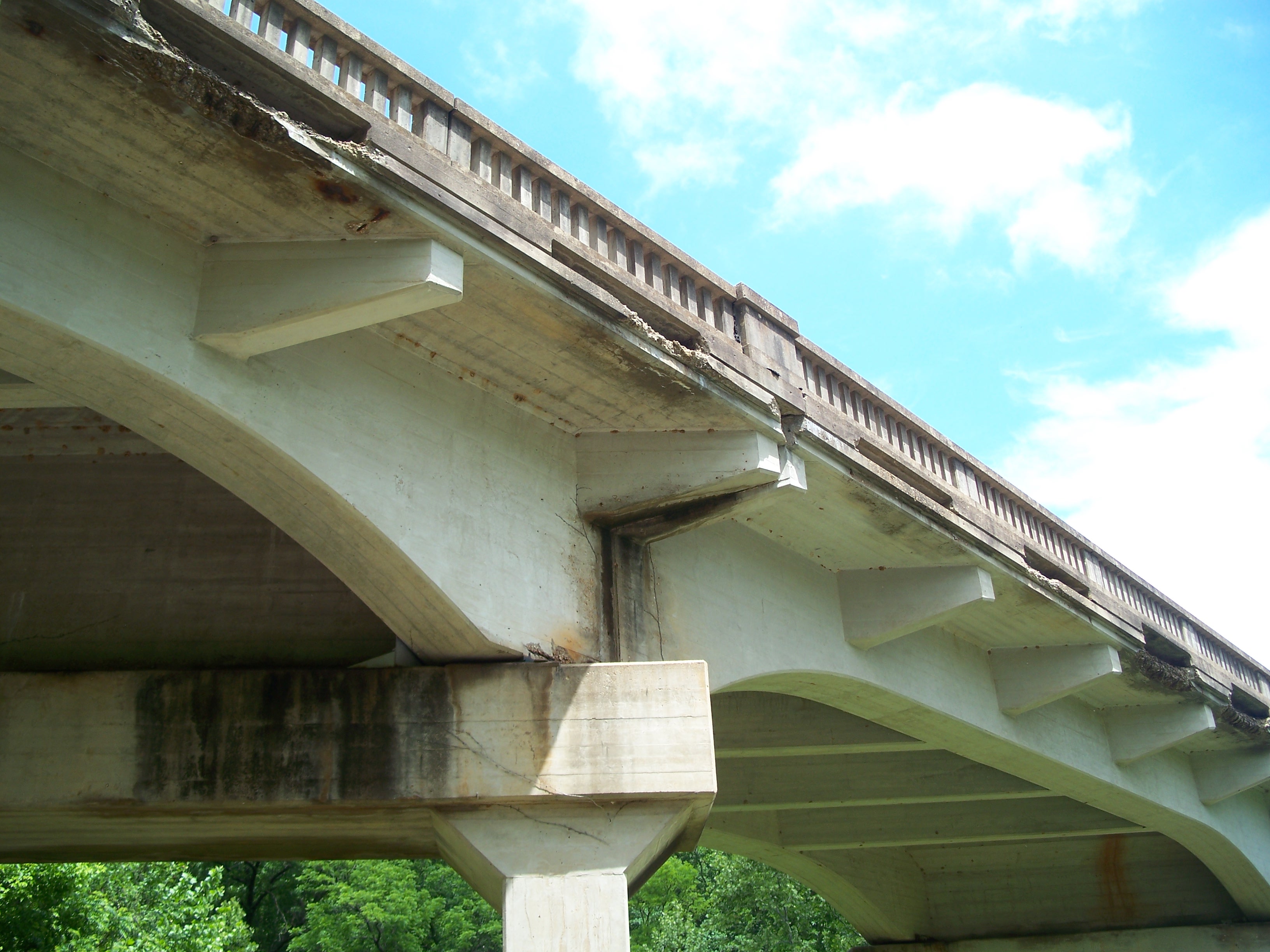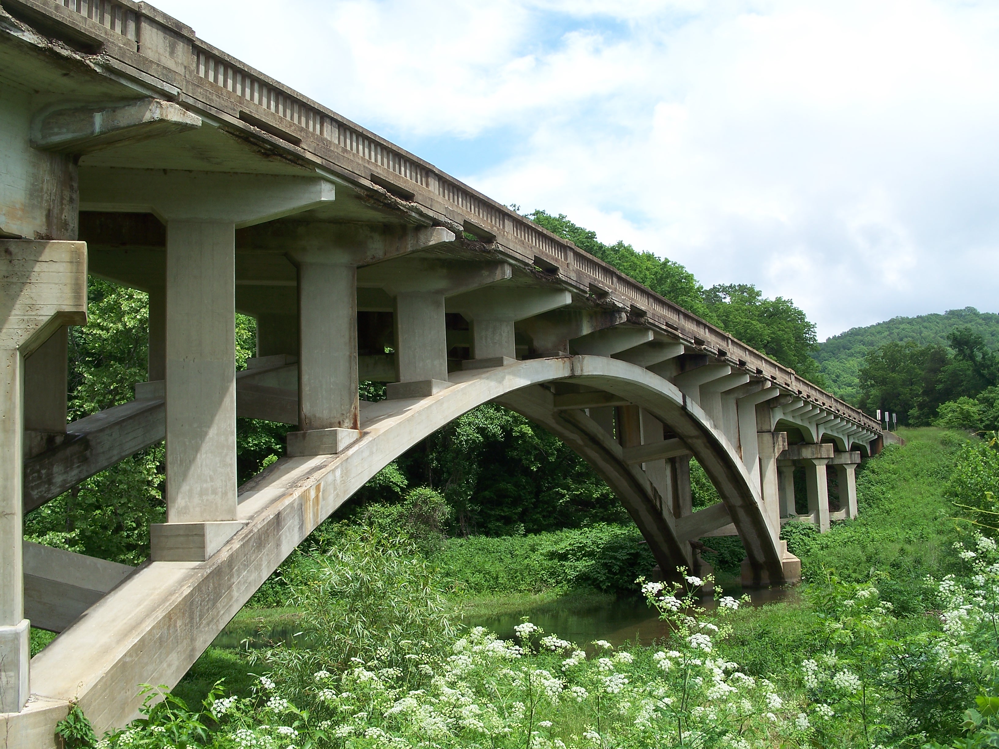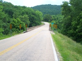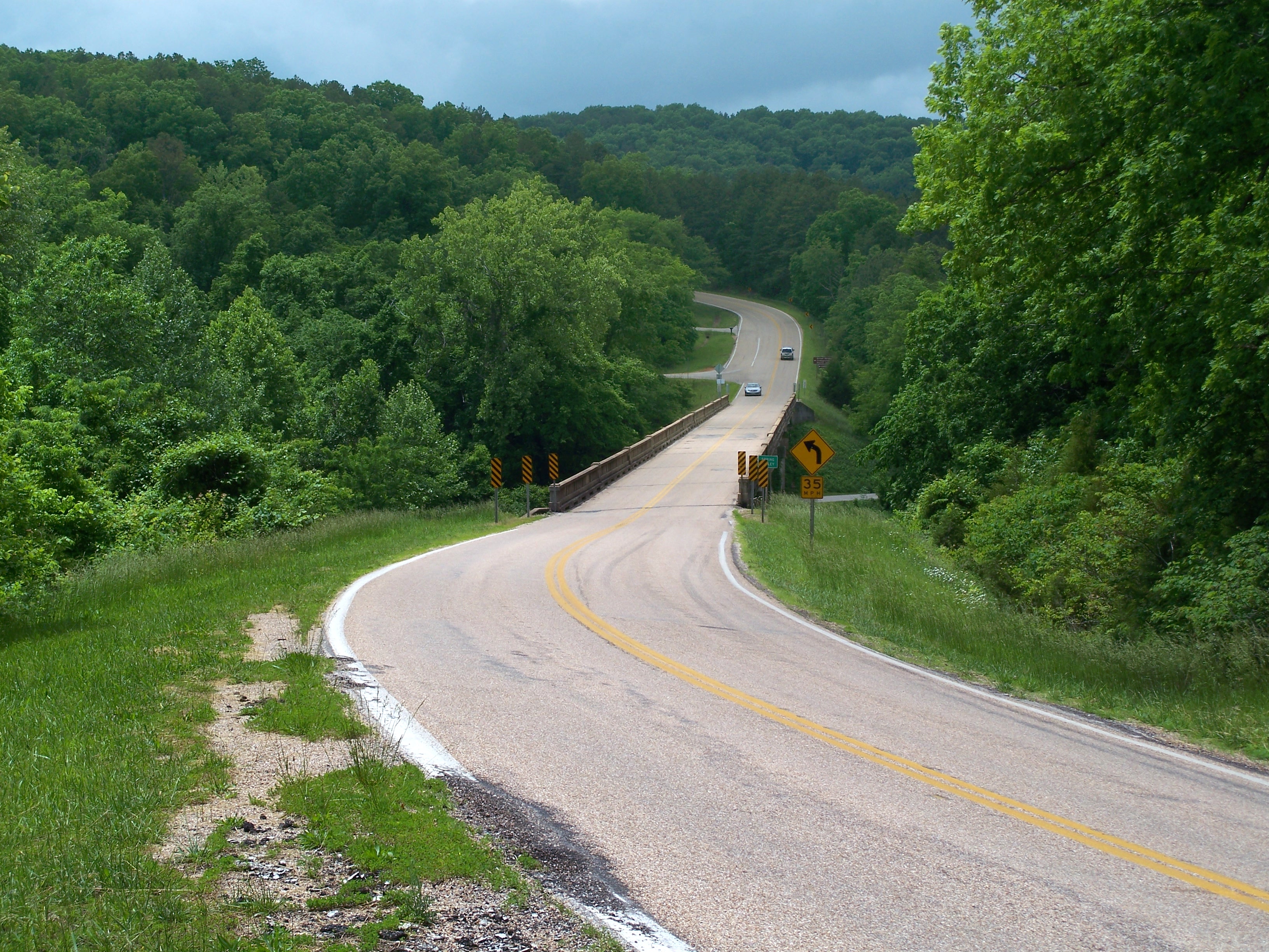The southernmost of the trio of bridges crosses a valley where Round Spring feeds into the Current River. The bridge is a two-rib, open spandrel concrete arch with one main 150-foot span with concrete deck girder approach spans on both ends for a total length of 523 feet. The bridge was built in 1930 for $70,152.85 and bears structure number J 420.