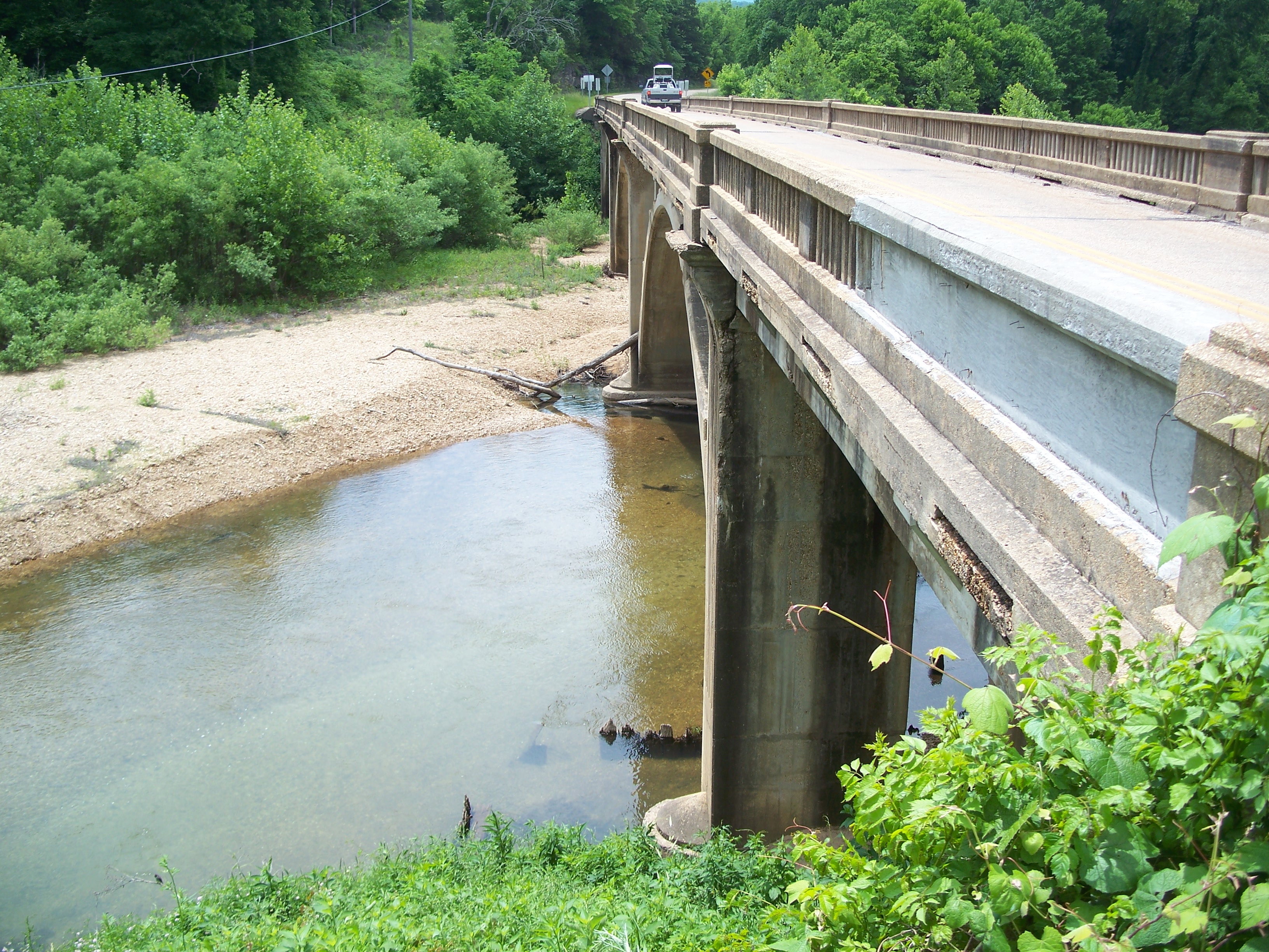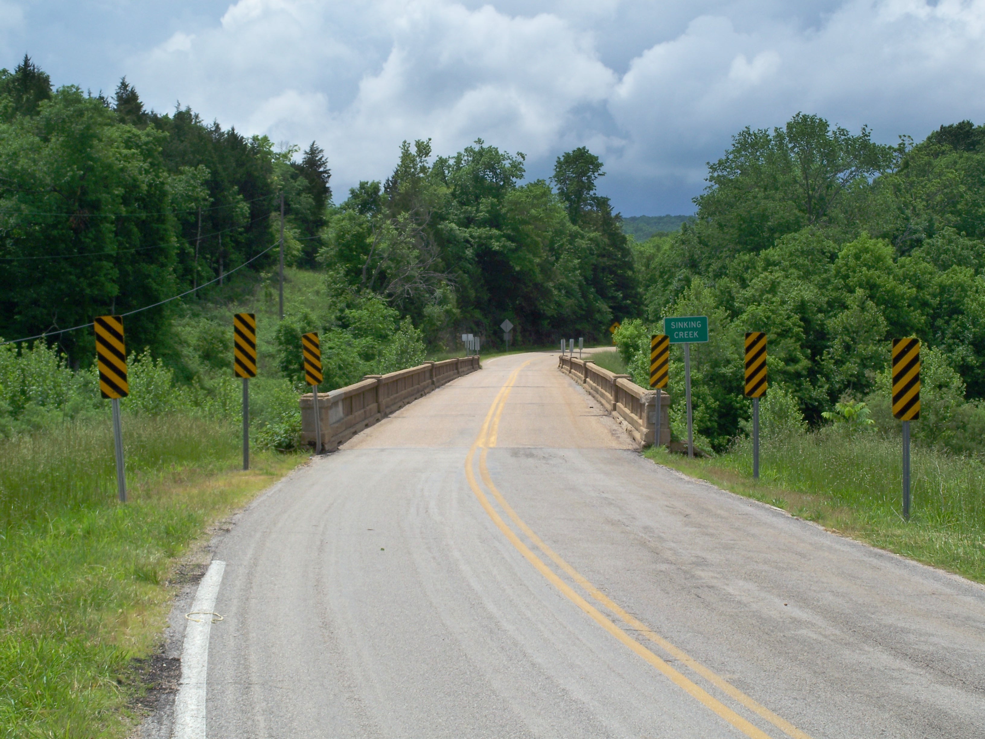 The northernmost of the three bridges crosses Sinking Creek, a tributary of the Current River just to the west. The bridge is a 2-rib, open spandrel concrete arch with three 80-foot spans and a total length of 339 feet. It was built in 1925 for $38,724 and bears structure number H 79.