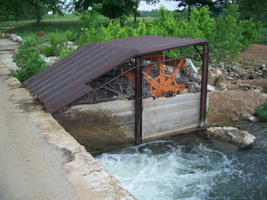 This 185-foot reinforced concrete slab bridge carries Griffin Road over the south fork of the Spring River to the southwest of Hardy, AR. The National Bridge Inventory lists the bridge as being built in 1965, although the unused metal water wheel on the north edge of the bridge seems a bit anachronistic for something that recent.