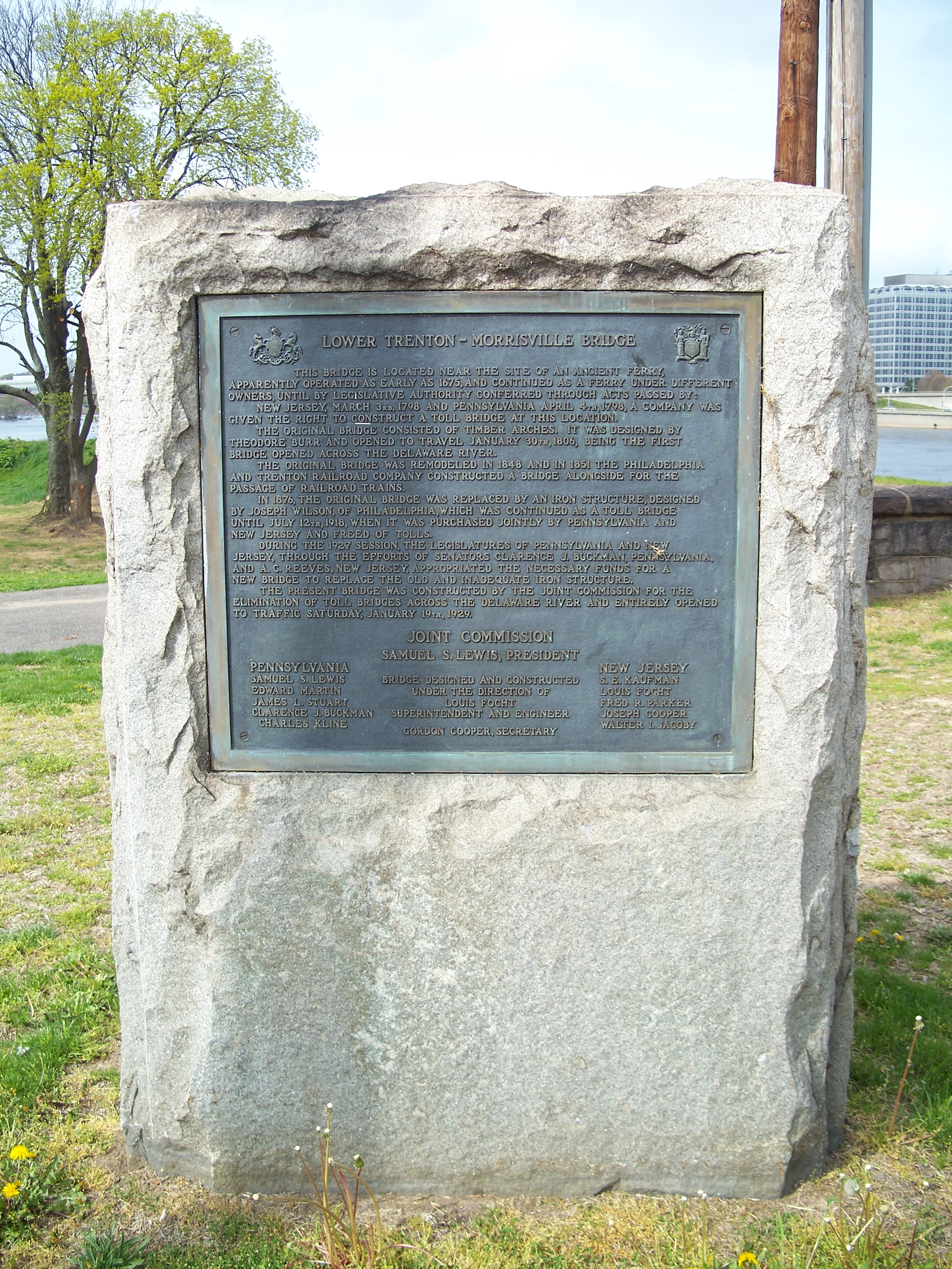A historic marker near the bridge on the south bank indicates that this was the site of a ferry crossing as early as 1675. A timber arch toll bridge opened to traffic in 1806 and was joined in 1851 by a railroad bridge constructed by the Philadelphia and Trenton Railroad Company. An iron bridge replaced the wood bridge in 1876. This structure, the third at the site, replaced the iron bridge and opened to traffic on January 19, 1929.