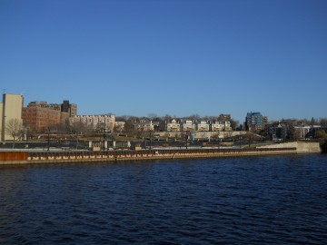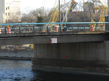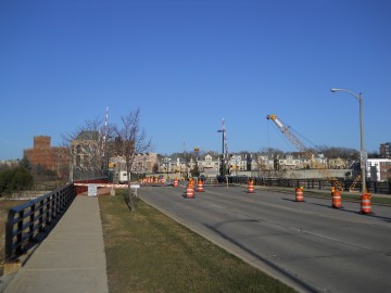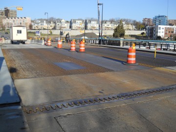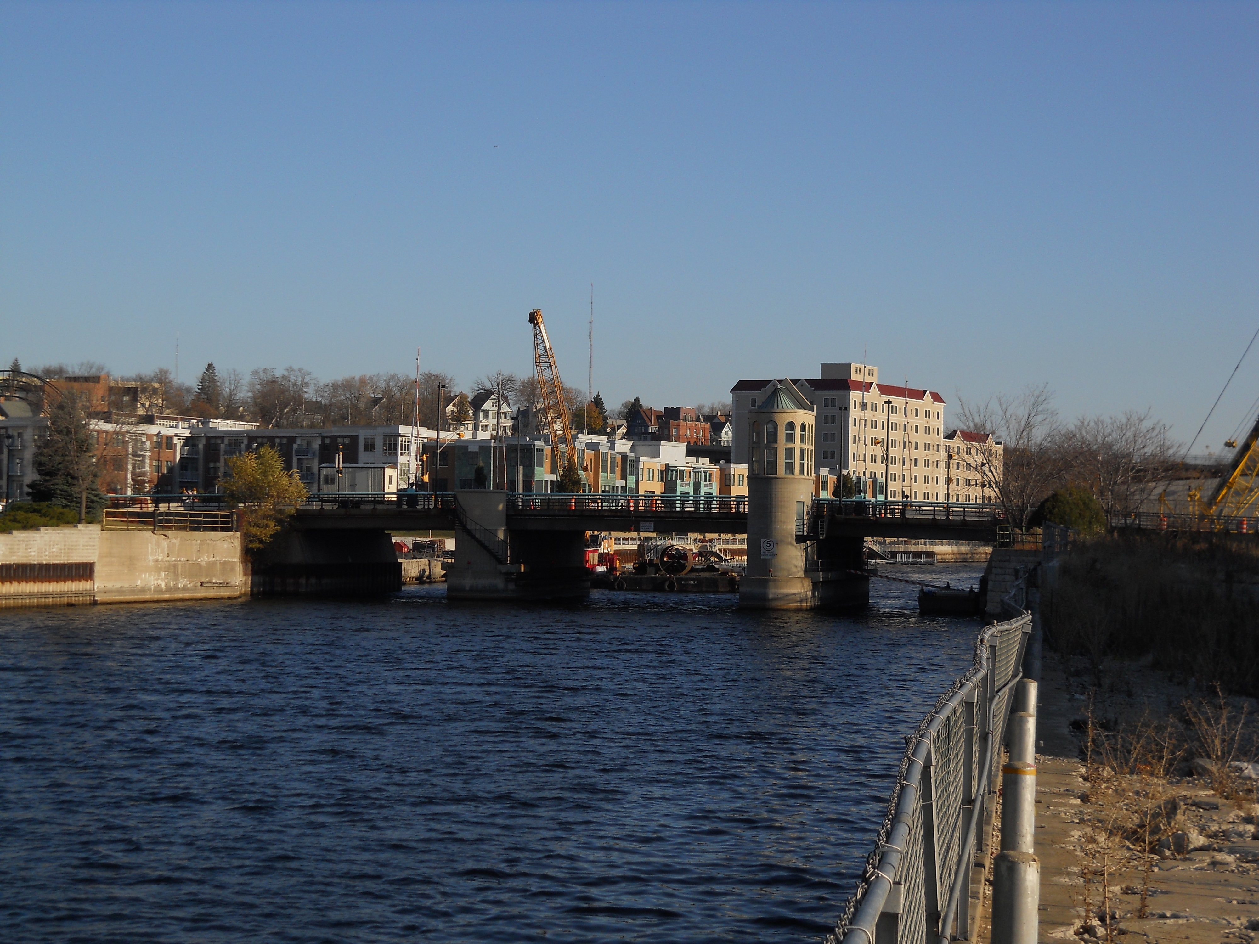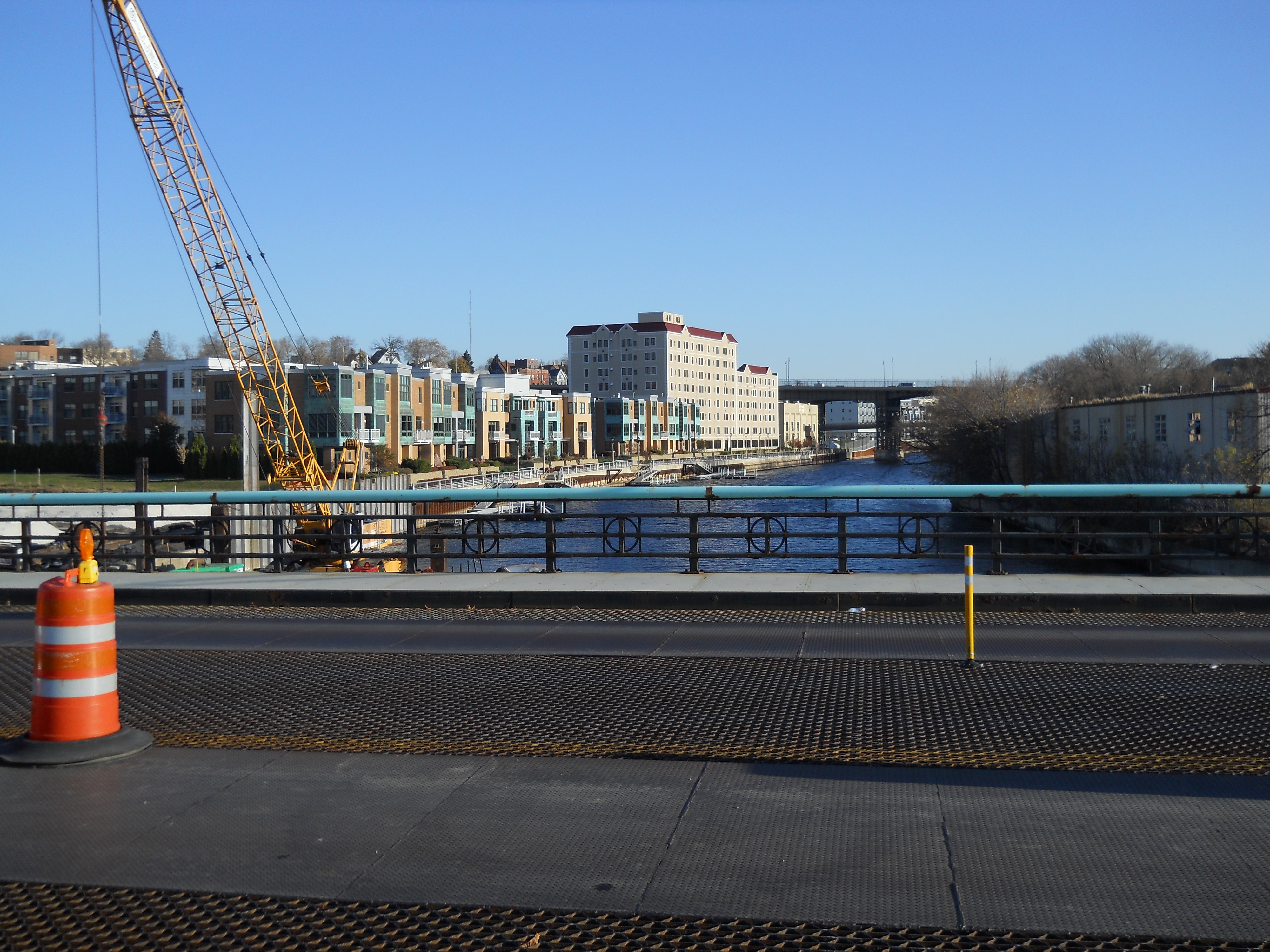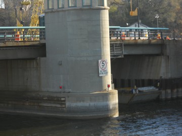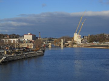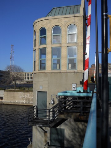 Despite its graceful bridge house towers, the Pleasant Street Bridge dates from 1972, with a renovation in 1990. The 162-foot length includes a 68-foot bascule span.