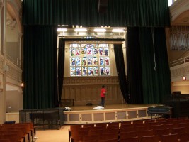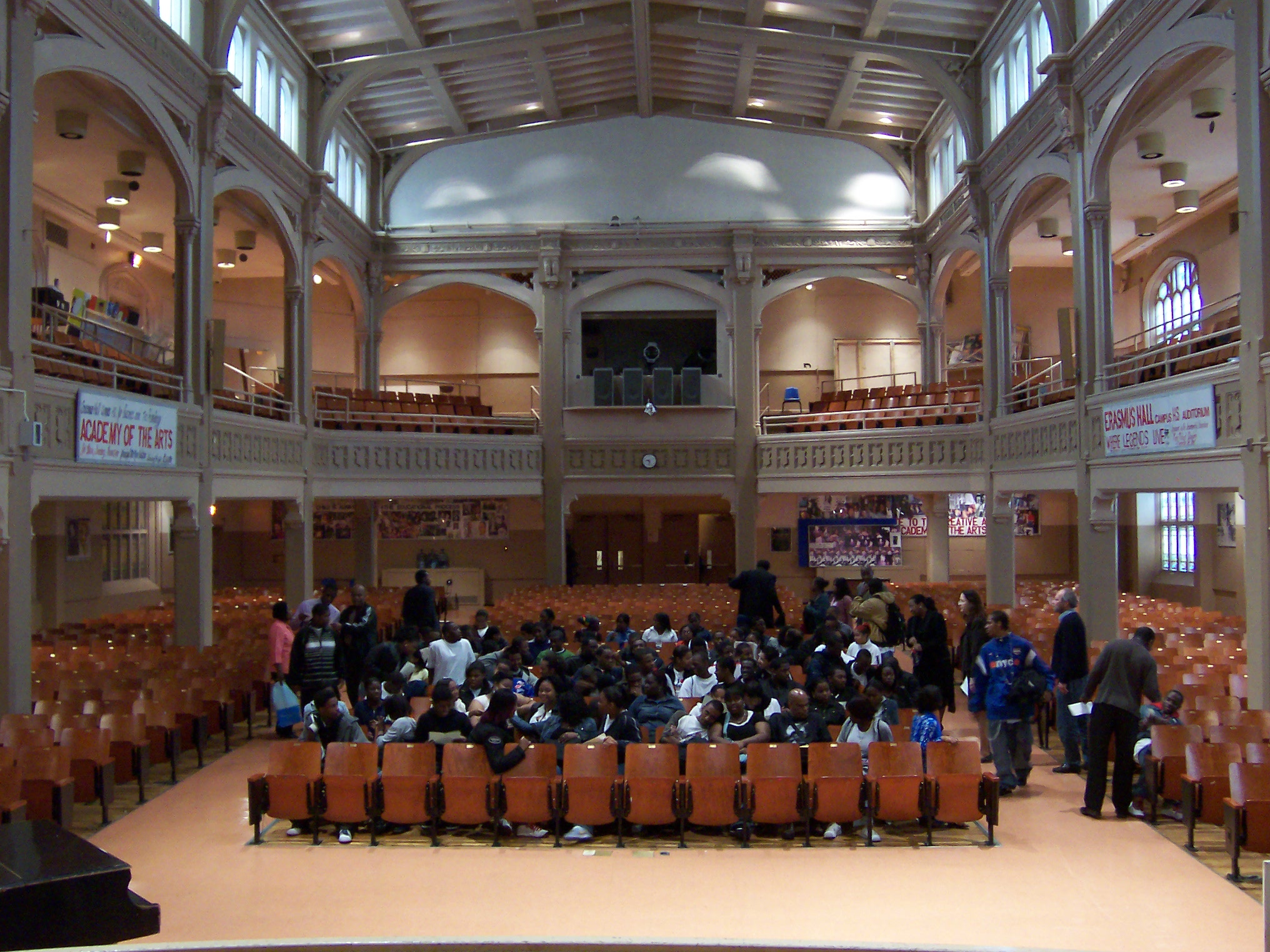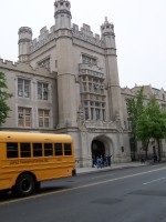 Erasmus Hall High School in Flatbush, Brooklyn is named for Dutch scholar Desiderius Erasmus. The school consists of four Collegiate Gothic buildings that were designed by NYC schools architect C.B.J. Snyder and built between 1903 and 1940. The four buildings form a quadrangle around a campus green that contains the original 1786 wooden school building. The academy's founders included Alexander Hamilton, Aaron Burr, John Jay and George Clinton. The list of notable alumni is long and varied and includes Mae West, Neil Diamond, Bobby Fischer, Stephanie Mills and Barbara Streisand. When I was there in 2006 we played in what appeared to be an old chapel for an inattentive audience. No dressing rooms or lights. Difficult parking.