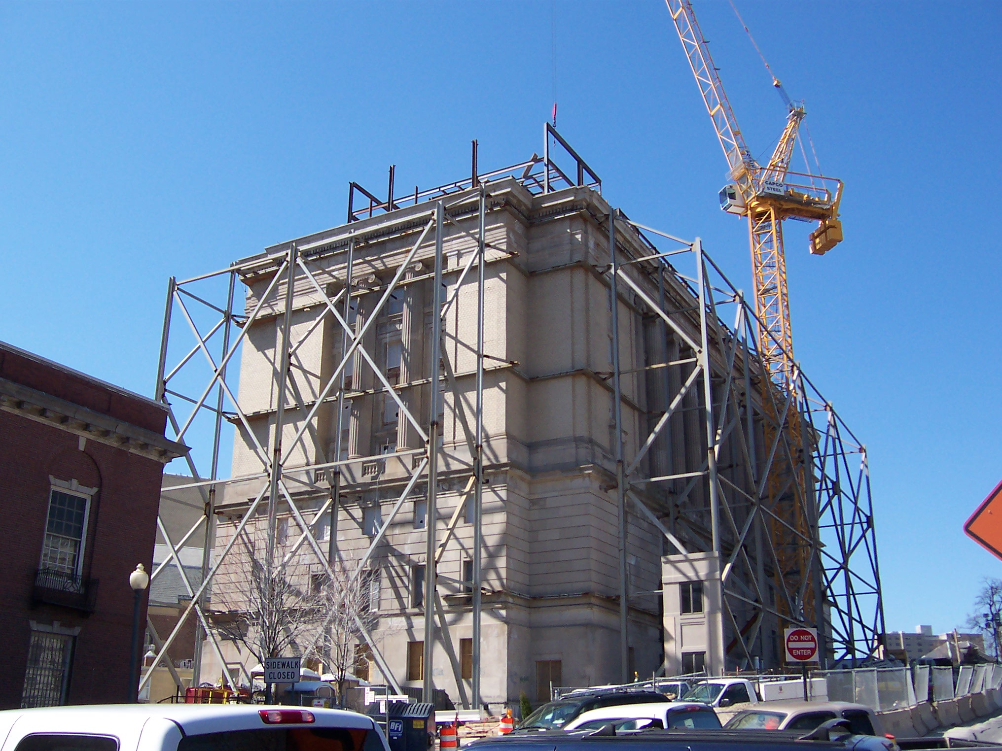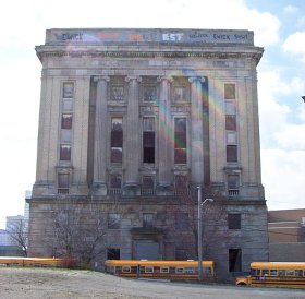 Construction on the Providence Masonic Temple began in the early 1920s near the State Capitol with plans for two Greek Revival buildings linked by a triangular structure at ground level. When the depression hit, construction on the buildings (with largely completed exterior structures) was postponed and eventually abandoned. The City of Providence took over the derelict buildings in the 1980s and completed work on the Auditorium, leaving its sister building a spooky, brooding shell just next door.
