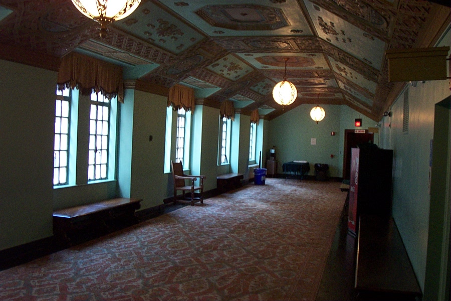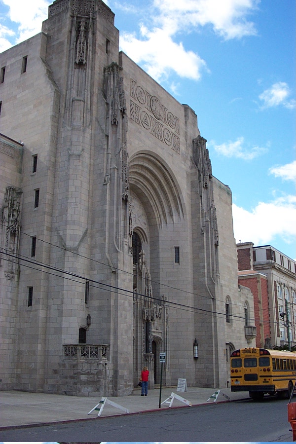 Auditorium in the Neo-Gothic and Romanesque Scranton Masonic Temple and Scottish Rite Cathedral. The rectangular plan building is clad in coursed ashlar Indiana limestone supported by a structural steel framework. The temple-cathedral originally included the main auditorium, a grand ballroom, an eight lane bowling alley, a library, a "Ladies Parlor," two formal lodge rooms, a billiard and card parlor, and a smaller theater / lodge hall combination. The facility was later operated and maintained by a non-profit corporation as the Scranton Cultural Center.