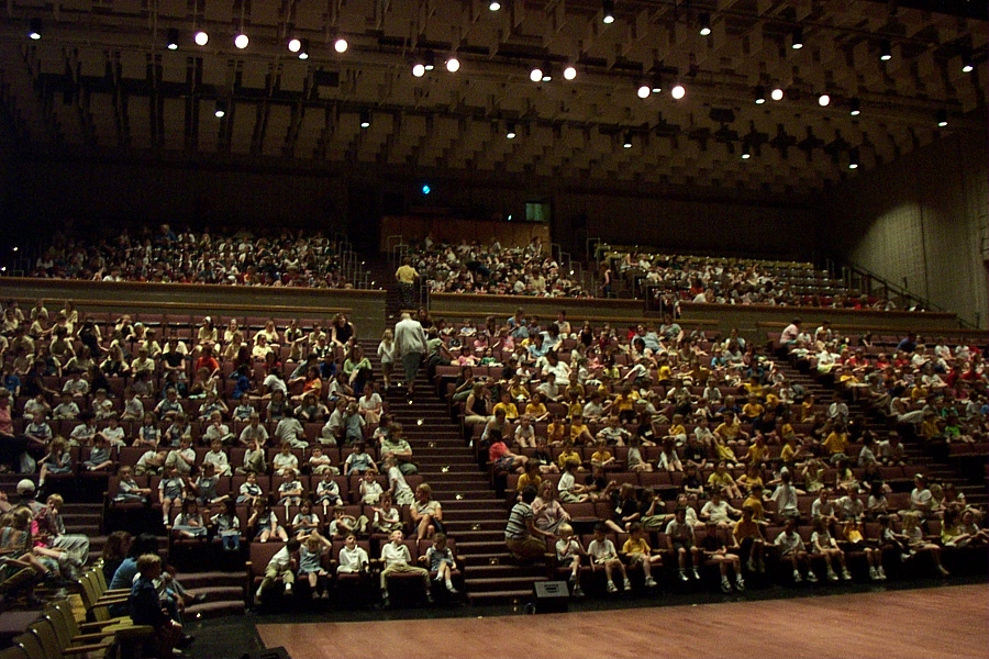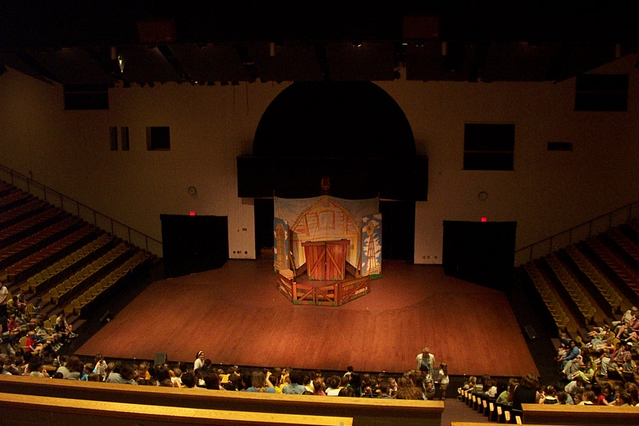 A high school auditorium notable for its large, square thrust stage and severely raked seating. It was the 70's, what can you say.