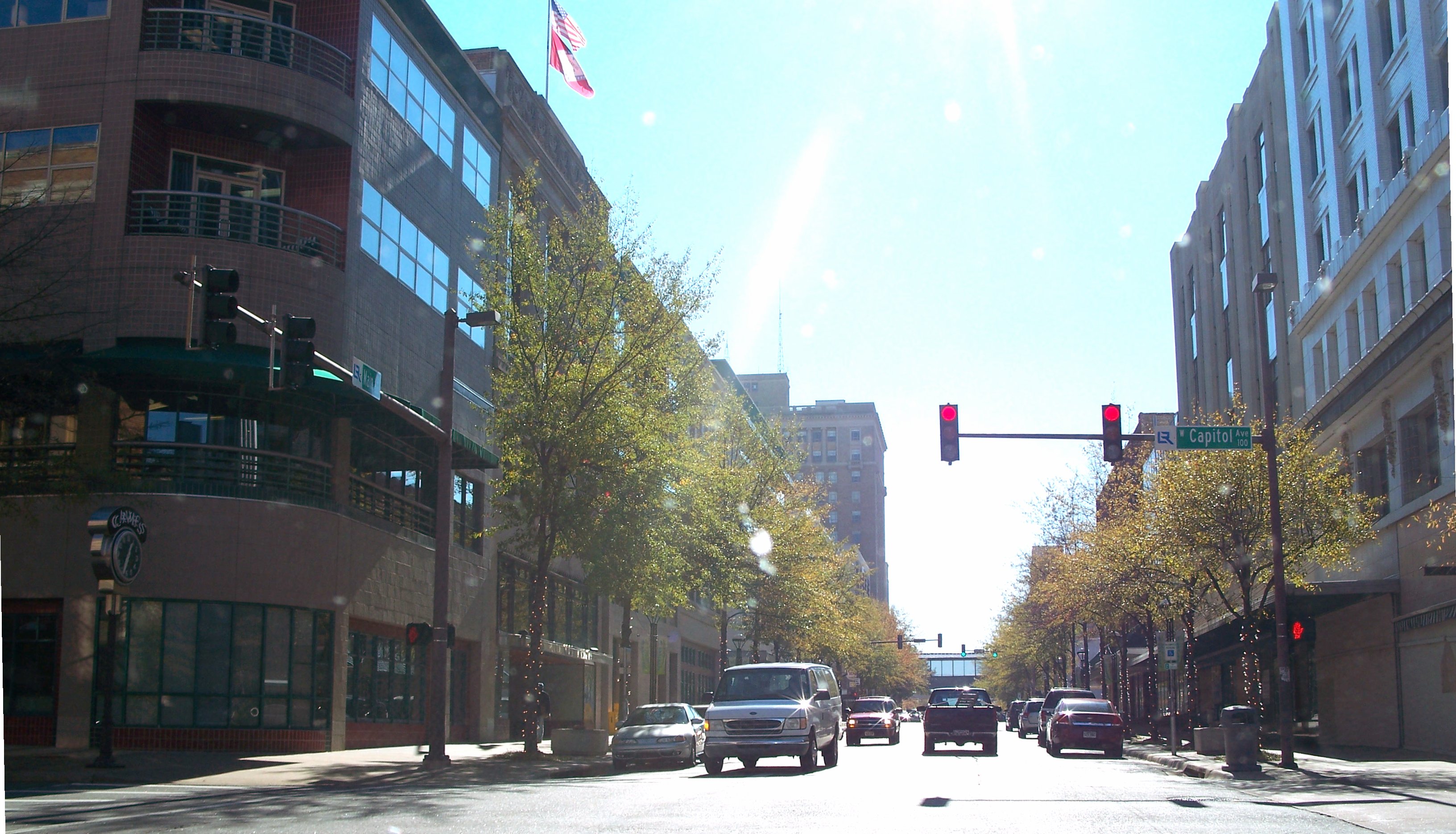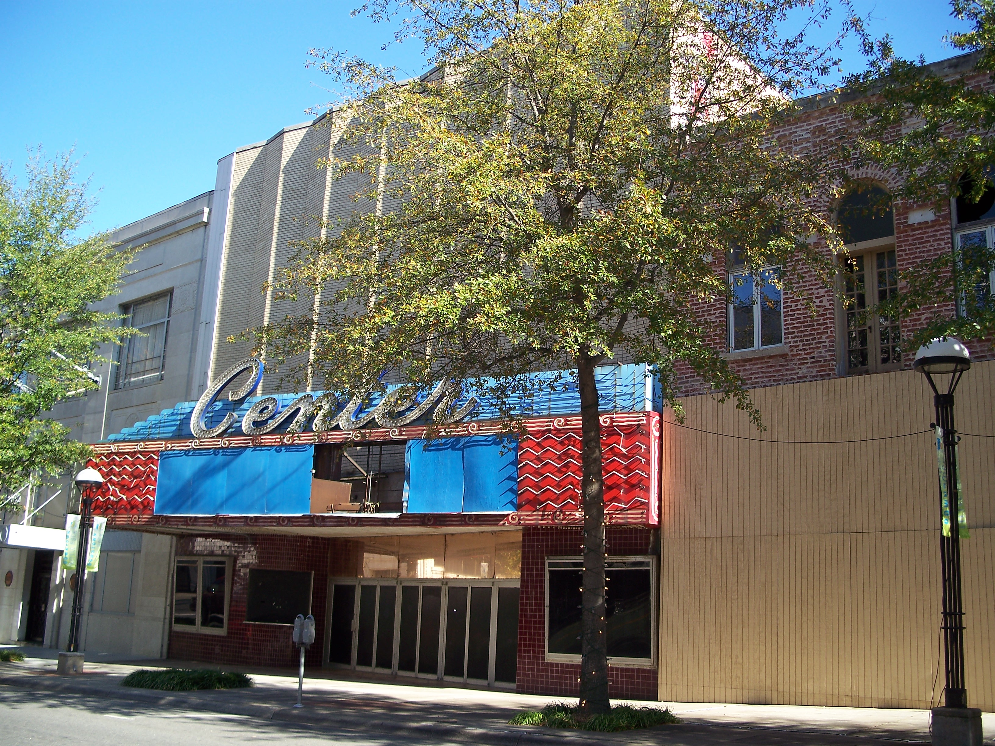 In the 1949 Film Daily Yearbook, (before TV and white flight decimated downtown theatres) there were four movie theatres listed on Main Street, the 500-seat Rex Theatre (106 Main), the 880-seat New Theatre (112 Main), the 330-seat Roxy Theatre (205 Main) and the 900-seat Royal Theatre (407 Main). At some point since then, The Royal was renamed the Center Theatre. Though obviously closed, like almost everything else on Main Street, supposedly the property is being held by a speculator with the hopes that the area will experience a rebirth similar to the Rivermarket district just up the street. The Art Moderne building was placed on the National Register of Historic Places in 2003 (#03000422).