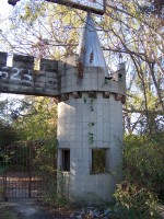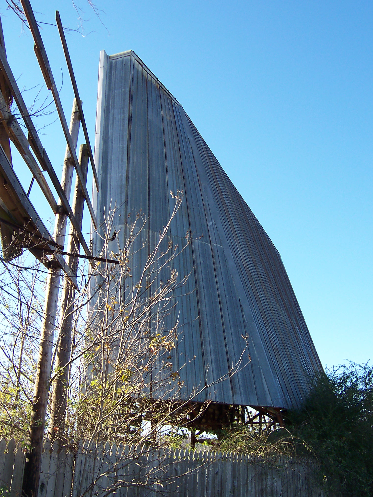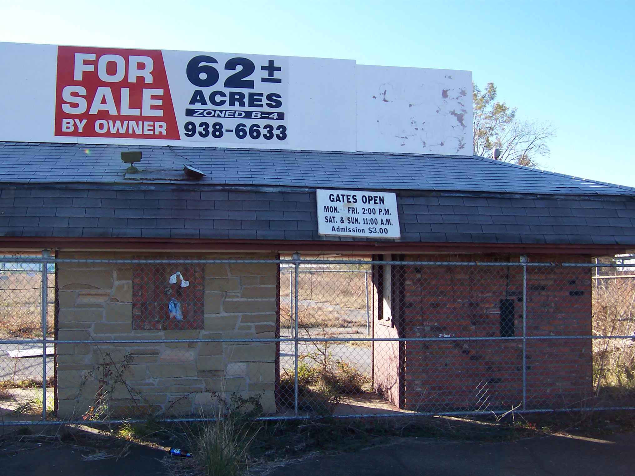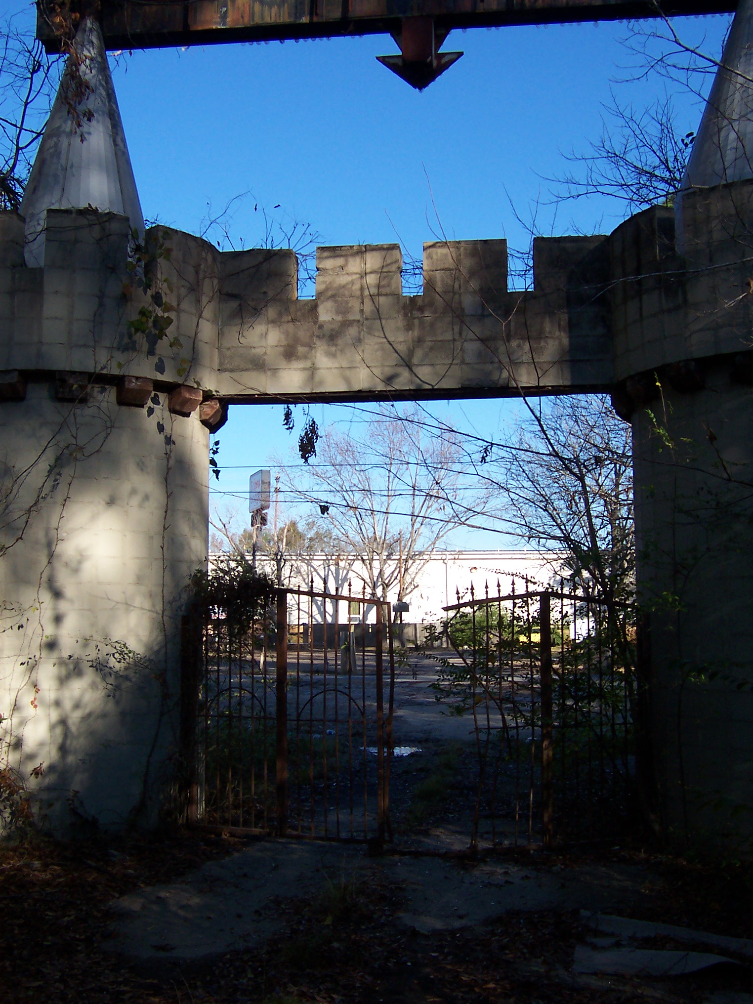 More interesting is a gate that is the remnant of the Royal Land amusement park, which presumably had some connection with the drive-in as an entertainment complex. A blog posting mentioning the park indicates that it closed after financial problems associated with a ride injury and briefly served as an RV park. Although I chose not to venture through the weeds, supposedly some fountain bases remain from the amusement park days.