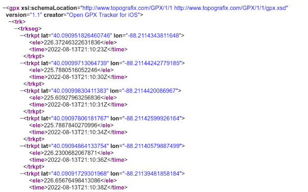 Although GPX files can contain a variety of different types of data, the data of primary interest is usually a sequence of waypoints, which are GPS latitude/longitude locations that are regularly captured by the tracking app as it records.