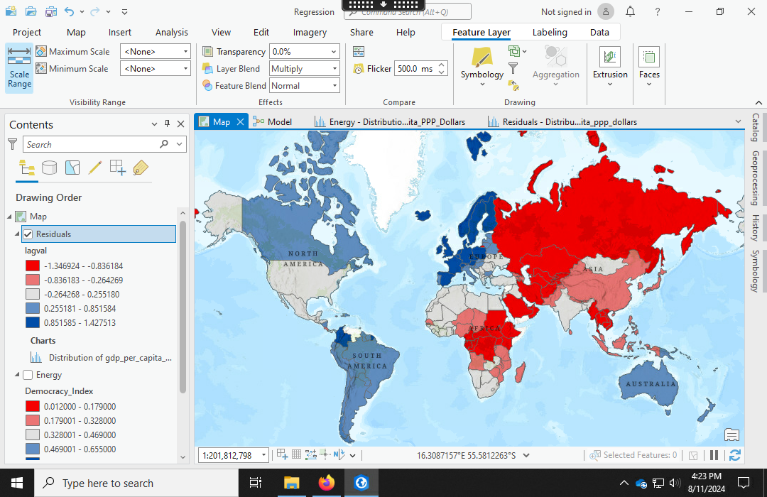 - Right click on the Output Feature Class and select Add to Display so the tool will add a new layer symbolized by the regression residuals.