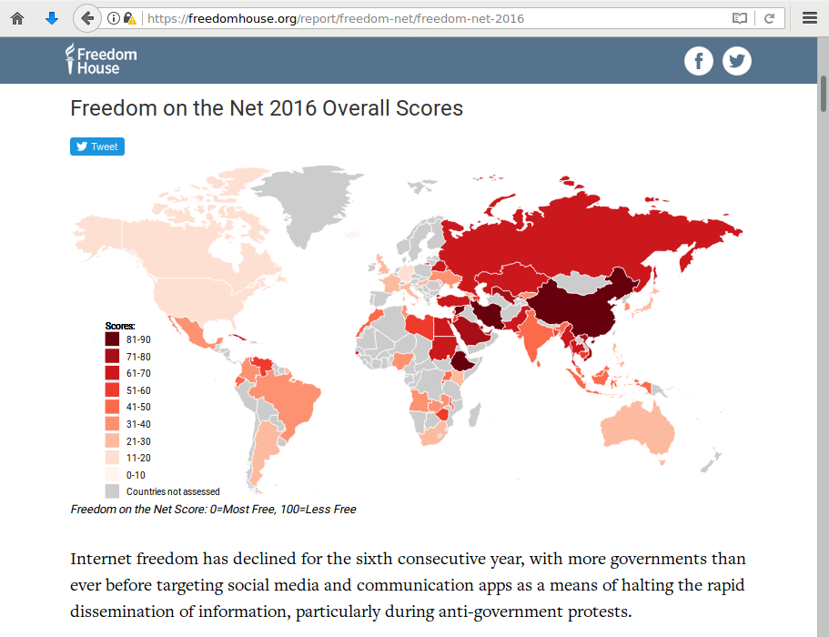 Freedom House's 2016 Freedom on the Net report documented a continuing global decline in internet freedom, with 2/3 of all internet users living in countries where criticism of the government is subject to censorship, and 1/4 of internet users living in places where people have been arrested for sharing content on Facebook.