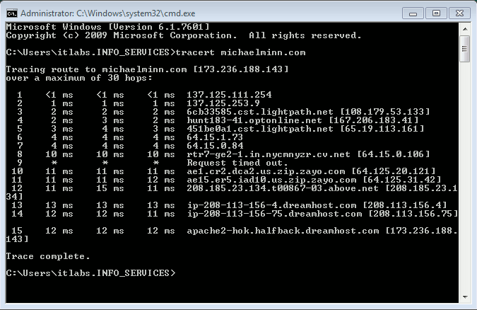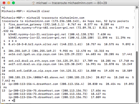 traceroute to michaelminn.com (173.236.188.143), 30 hops max, 60 byte packets 1 FIOS_Quantum_Gateway.fios-router.home (192.168.1.1) 0.413 ms 0.512 ms 0.622 ms 2 lo0-100.NYCMNY-VFTTP-402.verizon-gni.net (72.89.78.1) 8.487 ms 8.531 ms 8.583 ms 3 B3402.NYCMNY-LCR-21.verizon-gni.net (100.41.138.178) 11.419 ms 11.475 ms 4 B3402.NYCMNY-LCR-22.verizon-gni.net (100.41.138.180) 13.603 ms 5 0.et-10-3-0.BR2.NYC4.ALTER.NET (140.222.1.61) 22.855 ms 22.862 ms 22.915 ms 6 204.255.169.2 (204.255.169.2) 15.840 ms 9.046 ms 8.963 ms 7 ae16.cs2.lga5.us.zip.zayo.com (64.125.29.222) 24.351 ms 21.768 ms 21.744 ms 8 ae4.cs2.dca2.us.eth.zayo.com (64.125.29.31) 18.532 ms 15.967 ms 18.889 ms 9 ae27.cr2.dca2.us.zip.zayo.com (64.125.30.249) 16.719 ms 15.530 ms 16.601 ms 10 ae15.er5.iad10.us.zip.zayo.com (64.125.31.42) 18.737 ms 15.222 ms 15.195 ms 11 208.185.23.134.t00867-03.above.net (208.185.23.134) 19.714 ms 17.447 ms 17.441 ms 12 ip-208-113-156-4.dreamhost.com (208.113.156.4) 21.032 ms 21.707 ms 20.965 ms 13 ip-208-113-156-73.dreamhost.com (208.113.156.73) 19.445 ms 14 apache2-hok.halfback.dreamhost.com (173.236.188.143) 19.462 ms 20.941 ms