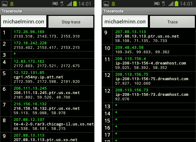 The following is an example of a traceroute listing to michaelminn.com through a home internet connection: