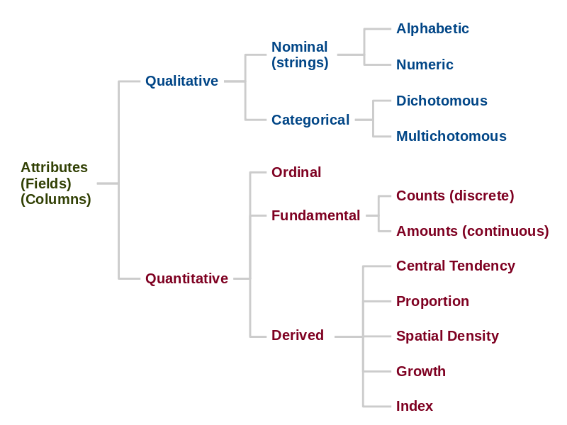 Variables can be classified by the types of information they represent. The classification is important because it determines what kind of analysis can be performed on that attribute, and what kinds of charts or maps are appropriate for visualizing that attribute.