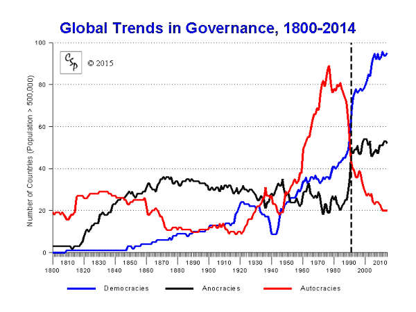 Based on these characteristics, CSP classifies governments as Democracies, Autocracies, or Anocracies (a mix of Democracy and Autocracy). Based on their analysis, governments in the world have become more democratic over the past two centuries: