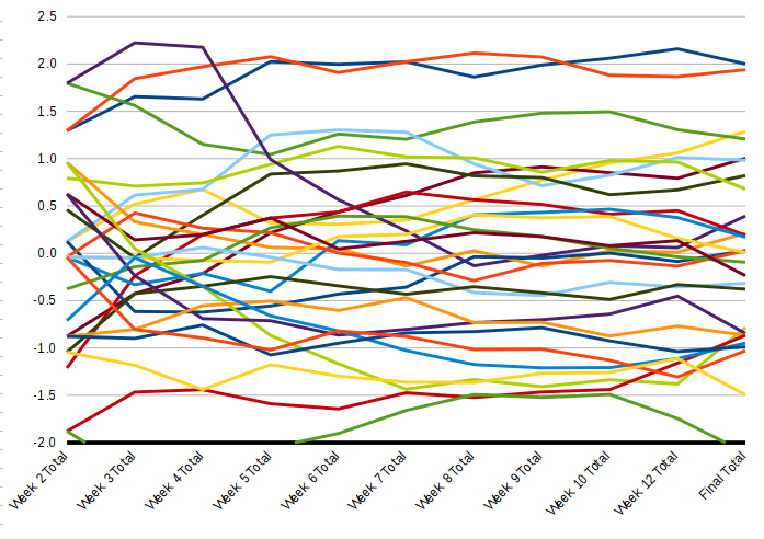 The performance of individuals over a semester can fluctuate widely, especially in cases of students who have to deal with particularly difficult personal challenges over the semester. However many students also stay within a surprising narrow range over the semester.