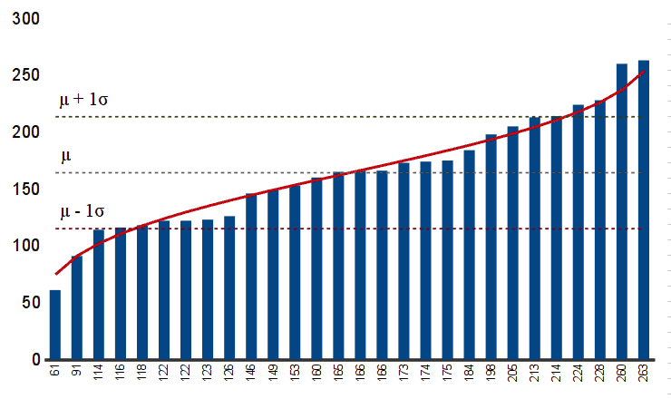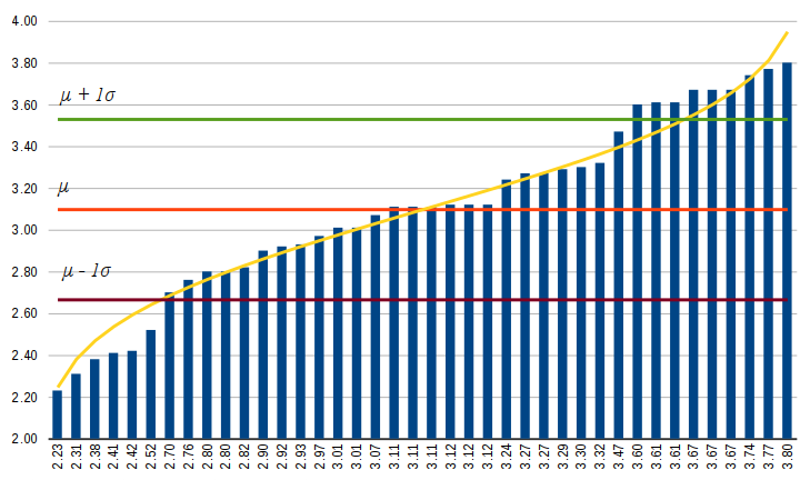This means you can place bars under the S-curve by rank order with the score of each student. If the distribution of scores is normal, the bars will line up with the curve.