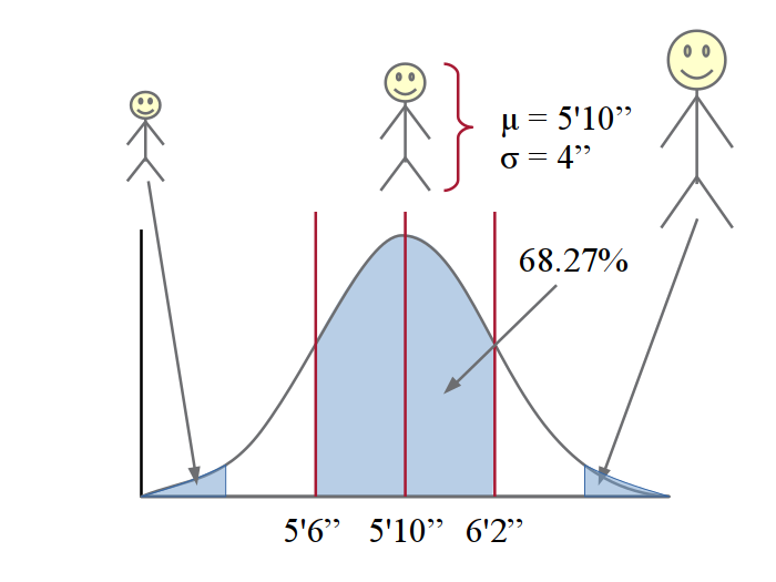 The number of very short men is the small area under the left tail of the bell curve, and the number of very tall men is the small area under the right tail of the bell curve. But most men are right in the middle around the mean.