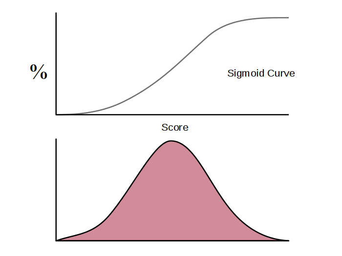 However, if you take the integral of the normal curve, you get the cumulative area, which forms a sigmoid curve. This curve is often called an s-curve because it resembles an S. The X-axis is the grade, and the Y-axis is the percentage of the class.