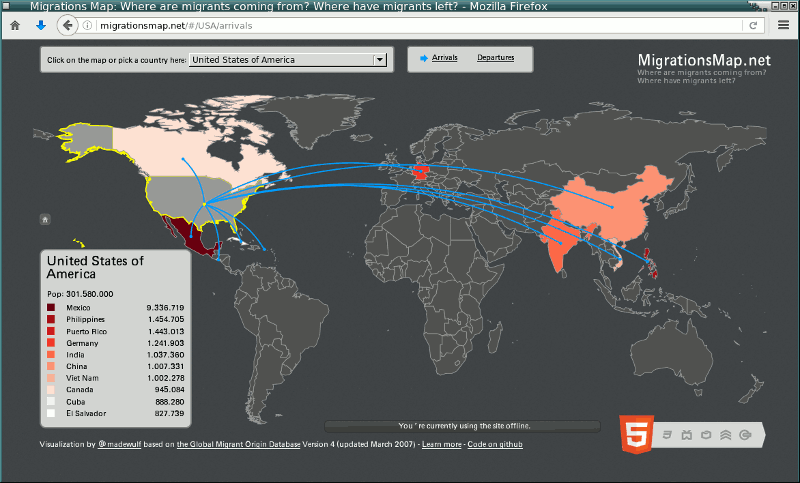 Patterns of migration are complex, with constant flows of people into, out of, and through countries. Martin De Wulf's MigrationsMap.net uses data from the (somewhat outdated) 2007 Global Migrant Origin Database to visualize estimates of migrant origin and destination countries around the world.