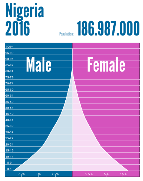 For example, Nigeria is a quickly growing country somewhere in stage II or III of the demographic transition. The country has a large, fertile cohort of young people, and a dependency ratio of 88. This presents significant stresses on resources, housing, infrastructure, education, etc.