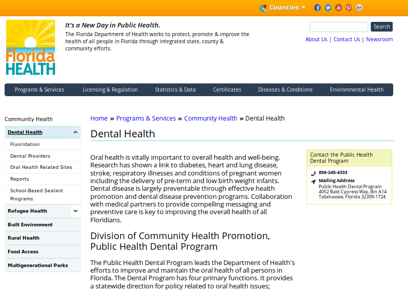 The Florida Department of Health. 2020. "Dental Health." Accessed 2 February 2020. http://www.floridahealth.gov/programs-and-services/community-health/dental-health/index.html.