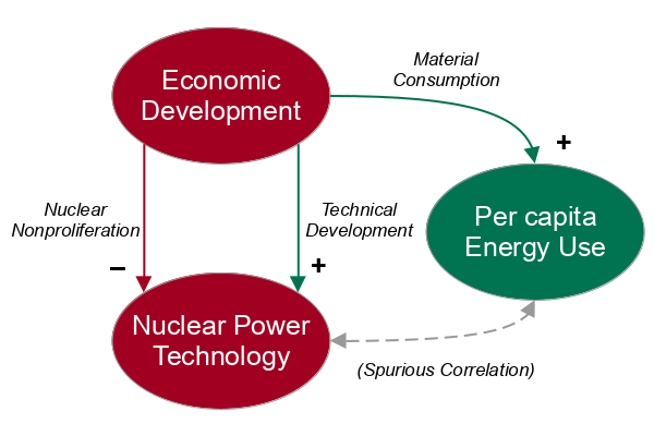 However, both the presence of nuclear power and high per capita energy use are probably more causally related through a third variable of early economic development, which results in higher energy use and the development of complex and expensive nuclear technology that is both economically out of reach of poorer countries, and which is actively blocked from proliferation for political reasons by wealthy countries.