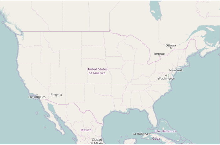 library(OpenStreetMap) upperLeft = c(55, -130) lowerRight = c(20, -60) basemap = openmap(upperLeft, lowerRight, type="osm") plot(basemap)