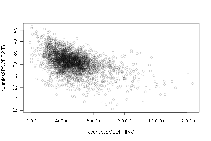 > plot(counties$MEDHHINC, counties$PCOBESITY, col="#00000040")