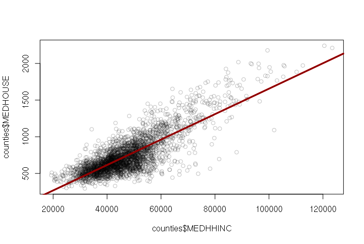 > plot(counties$MEDHHINC, counties$MEDHOUSE, col="#00000040") > model = lm(MEDHOUSE ~ MEDHHINC, data=counties) > abline(model, col="darkred", lwd=3)