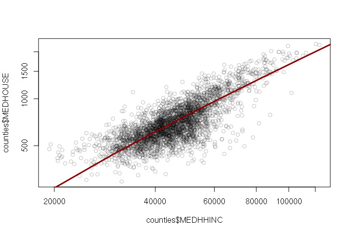 plot(counties$MEDHHINC, counties$MEDHOUSE, col="#00000040", log="xy") model = lm(MEDHOUSE ~ MEDHHINC, data=counties) x = seq(0, 200000, 10000) y = predict(model, newdata=data.frame(MEDHHINC = x)) lines(x, y, lwd=3, col="darkred")