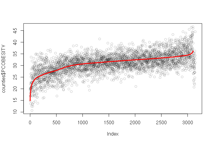 model = lm(PCOBESITY ~ MEDHHINC + WEST + URBAN, data=counties) counties$PREDICTED = predict(model, newdata = counties) counties = counties[order(counties$PREDICTED), ] plot(counties$PCOBESITY, col="#00000040") lines(counties$PREDICTED, type="l", col="red", lwd=3)