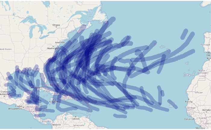 Because individual storms are represented as sequences of waypoints, we can connect those waypoints to form lines that visualize the paths of the storms.