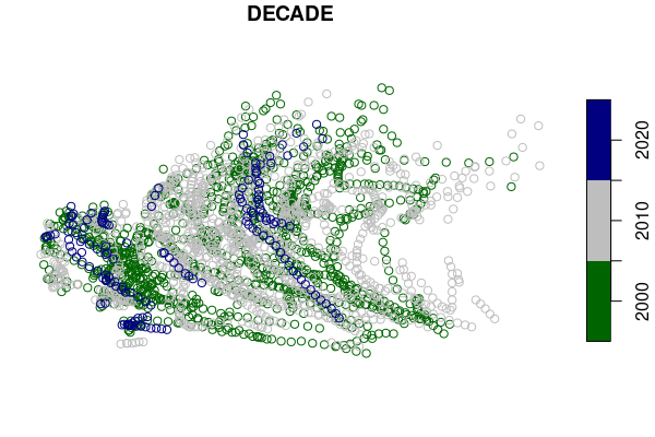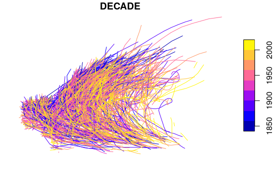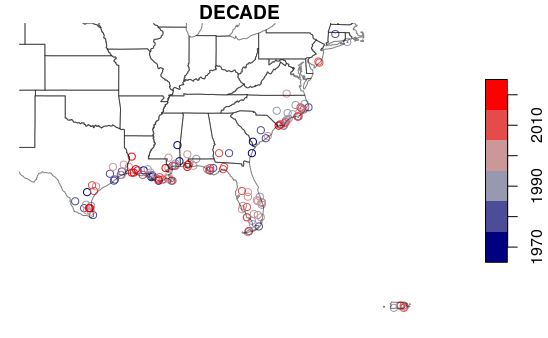 plot(waypoints.hurricanes["DECADE"], pal=palette, add=T)