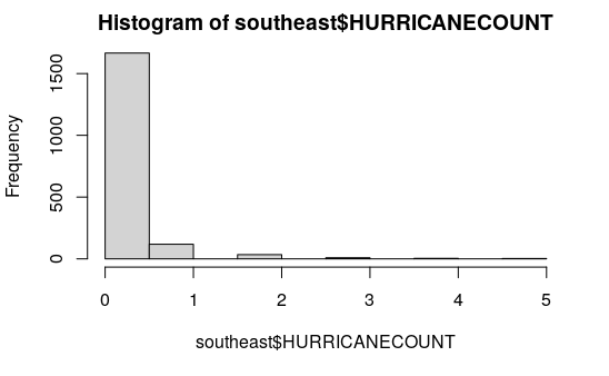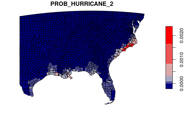 southeast$PROB_HURRICANE_0 = dpois(0, lambda = southeast$HURRICANECOUNT / 20.0)