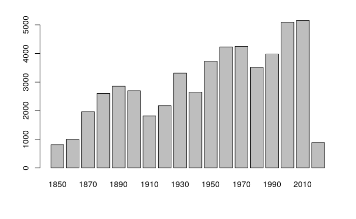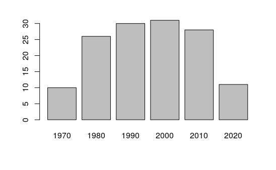 nrow(panel) [1] 52717 range(panel$DATE) [1] 18510625 20201118 table(panel$STATUS) DB EX HU LO SD SS TD TS WV 163 5532 15192 1376 309 636 10184 19187 138 barplot(table(panel$DECADE))