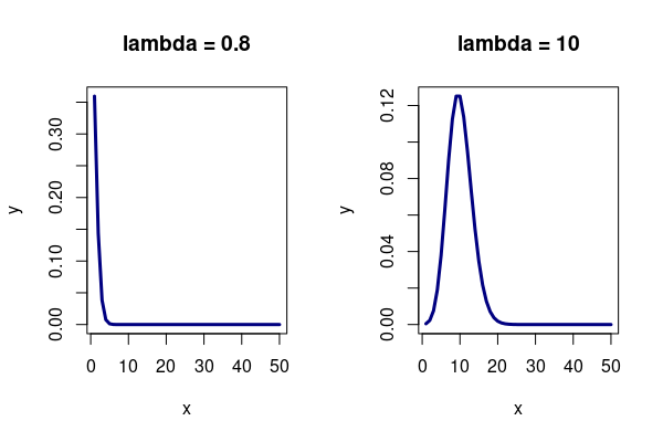 par(mfrow=c(1,2)) x = 1:50 y = dpois(x, lambda=0.8) plot(x, y, type="l", lwd=3, col="navy", main="lambda = 0.8") y = dpois(x, lambda=10) plot(x, y, type="l", lwd=3, col="navy", main="lambda = 10")