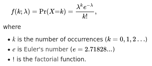 In the diagram below for λ = 10, we see a peak mode around the lambda value, with the probability of higher or lower values dropping off on both sides of λ.